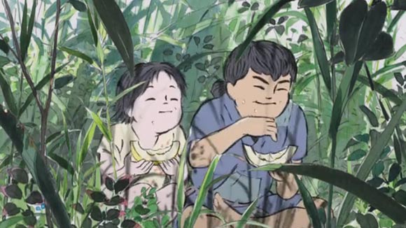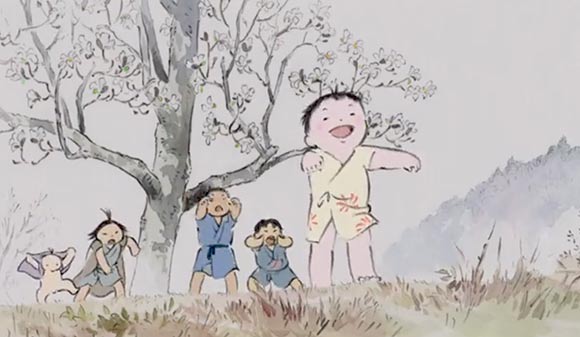 Studio Ghibli’s The Tale of the Princess Kaguya, based on a 10th century Japanese folk tale, has plenty of ma and the tale itself is incomplete, with hints of magic. Even after screening it several times, I still can’t tell you for certain why the character Li’l Bamboo shows up one morning as a thumb-sized child inside a freshly cut stalk of bamboo because director Isao Takahata is not explicit on the point. The character is just suddenly…there. The old bamboo cutter cuts a random stalk, and there she is, that’s all, a tiny beautiful jewel of a character. We in the audience are asked to willingly suspend our disbelief in such events, and so we do easily.