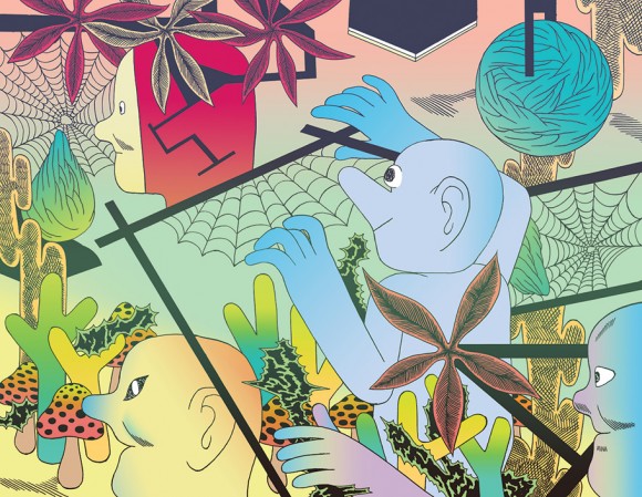 Patrick Kyle is a Toronto-based comic artist and illustrator. His non-traditional comic designs often feature troll-like creatures and a world rendered with a flat sense of abstract space and gradated pastel and neon hues. One series of drawings on Patrick’s website is directly inspired by the troll illustrations of Swedish artist John Bauer. Below is the cover to Patrick’s recent mini comic, Foreigners, published by Space Face Books.