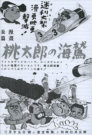 Annett reproduces an advertisement for the 1943 Japanese propaganda cartoon Momotaro’s Sea Eagles. Bluto, who appears in the film as an antagonist, is seen floating in front of the ruined Pearl Harbor. Splashing alongside him are three characters who are nowhere to be seen in the animation itself: Popeye, U.S. President Franklin D. Roosevelt, and Betty Boop. The war may have recast Betty as an enemy of Japan, but she was apparently still popular enough to be a box-office draw.