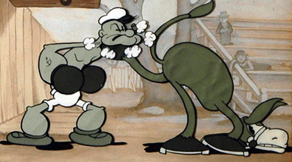 No, this isn’t a frame from the forthcoming digital restoration of the Max Fleischer Popeye cartoons. It’s an actual production cel and background from Let’s You and Him Fight (1934).