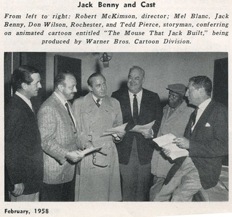 This is an excerpt from an issue of Warner Club News, the studio’s in house magazine, from February 1958. Each issue had a column, aptly titled “What’s Up, Doc?” written by a member of the cartoon division staff. I picked up half-a-dozen issues from the late 50s, early 60s at the recent Cinecon and I’ll be posting bits and pics from these issues all this week. The cartoon being discussed above was released in April 1959. To be included in the February ’58 magazine, I’d place the recording session in January ’58 or possibly December ’57.