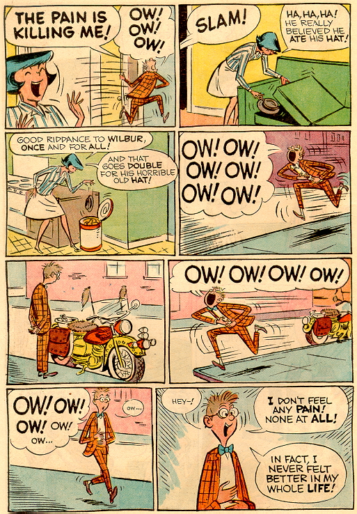 As far as I’m concerned, Wilbur stopping in the midst of his agony to stare pensively at a motorcycle is comedy timing at it’s best. A single panel, that’s all. He doesn’t notice it as he passes, doesn’t turn around and go back. We don’t see him stop, he’s just there. (cue the soundtrack of your choice; sometimes I hear a soft whistling, sometimes crickets, sometimes muzak) And then he’s screaming his head off again a panel later. Ah, the beauty of manic behavior!