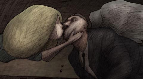 Bill Plympton’s feature Idiots and Angels opens in New York tomorrow and to celebrate, we’re giving away three Idiots and Angels movie posters signed by Bill Plympton. To win, simply be one of the first three (US or Canada-based) people to answer this question on Cartoon Brew’s Twitter account (make sure to direct the answer to us @cartoonbrew):
