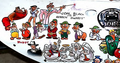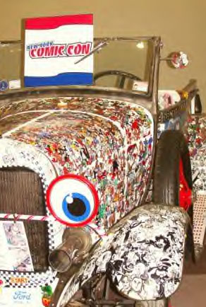 I just love doing art that is non-conventional. One of my hobbies is antique cars, my other love is comic art and animated cartoons. The idea hit…why not use a vehicle as a canvas. I chose one of the first Model A’s…a 1928 Ford Model AR Roadster Pickup. I decided to do a DOCUMENTARY ON COMICS on a HISTORIC VEHICLE. I started painting on October 18 2004 on the anniversary of the first published comic “The Yellow Kid” (October 18,1896) and finished on January 12, 2006. As much as possible, the truck was disassembled, a lot of it was painted in backbreaking positions. The only record I kept was on airbrush painting hours: over 2,000. This does not include original restoration of the Model A, research and layout. My goal now is to secure a sponsor so that I may get to the big national car shows and the comic conventions.