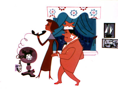 I love these images from the UPA industrial film LOOK WHO’S DRIVING (1954). The design is spare, yet artful. More importantly, it’s a lot of fun to look at. There’s an easy-going quality to the design which one rarely finds in designed animation nowadays. The shapes and colors are inviting and none of the visual elements feel forced or contrived. The film doesn’t employ this white-background technique for its entire length, but there is terrific design and layout throughout, and the added bonus is that it moves beautifully too. The film’s design credit went to Bob Dranko, with color styling by Dranko and Michi Kataoka, and direction by Bill Hurtz. (Judging from the way Hurtz worked on other films, he likely collaborated with Dranko on the layout and overall visual direction of this film.) Hurtz was also one of the designers on GERALD MCBOING BOING (1950), the quintessential example of a UPA film that reduced its backgrounds to the bare essentials. LOOK WHO’S DRIVING perhaps doesn’t reach the classic status of GERALD — it is, after all, a driving safety film commissioned by Aetna Casualty and Surety Company — but it is no less entertaining and has much to recommend. Unfortunately, it’s also quite impossible to see nowadays, unless you happen to own a print of the film. Documenting obscure animated projects from the 1950s, like LOOK WHO’S DRIVING, was one of the goals for my upcoming book on 1950s animation design. So many stellar cartoons from that period are all but forgotten today, and I’m hopeful this book will play a small role in reintroducing some of the great “lost” cartoons of that era.
