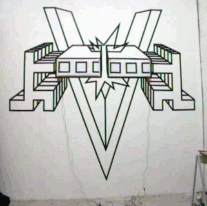 Towards the earlier part of his blog, you can also see some kinetic wall installations that Alec created using black lines (possibly made of tape or painted to look blocky and computer generated). The lines animate directly on the wall with small motors and a scroll of paper.