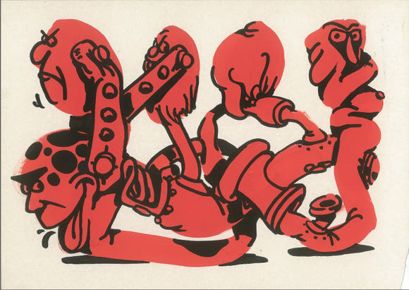 Horfée’s work is unified by the cartoon material that his characters and forms appear to be constructed with. His use of flabby tires, sagging sacks and folded tubes with deep black shadows reveal an array of classic cartoon influences. Horfée clues us in by mixing posts of artwork that he likes with his own work on his Tumblr. These posts include images from the Fleischer Studios, Bakshi Studios, and Vaughn Bodé.