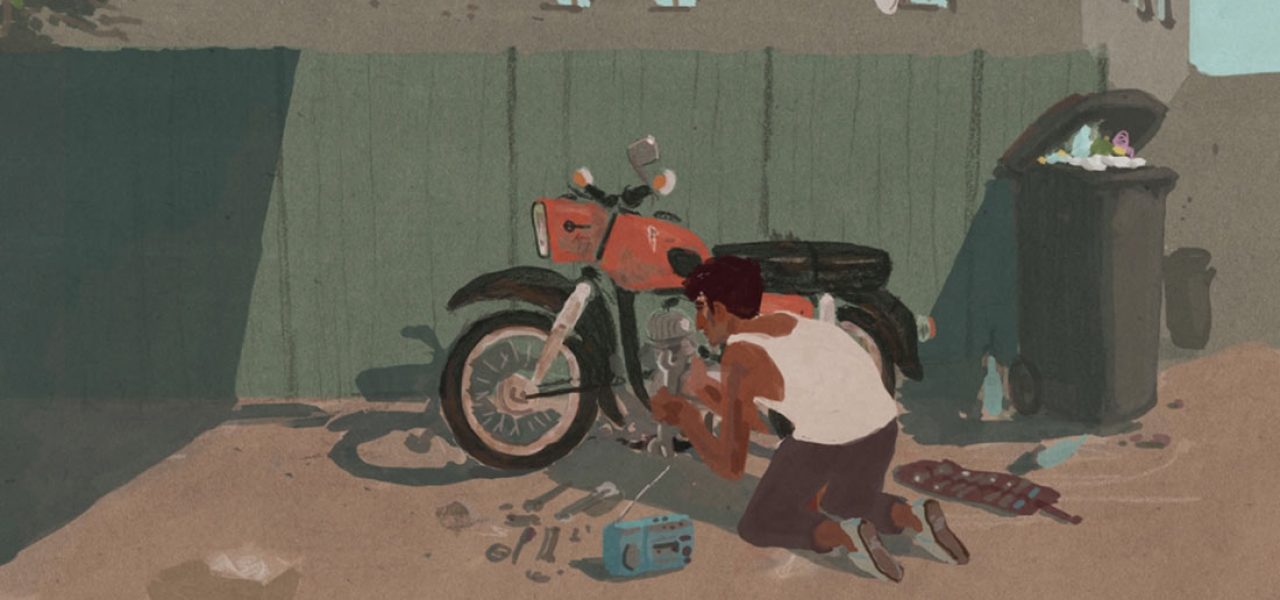 “Julius can’t sleep. To get his head empty he decides to go on a roadtrip, but somehow he can’t manage to leave. A hand-drawn film about failure, insomnia, a red motorbike, pretty bargirls, the desolateness of Berlin (even in summer) and waterproof socks.”