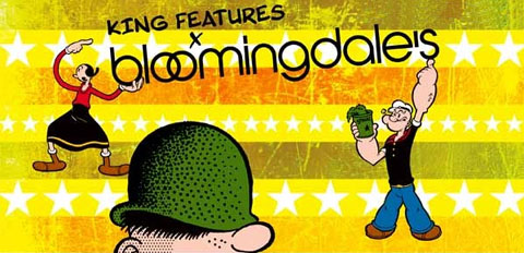 I love Popeye cartoons as much as the next guy – maybe a little more than the next guy – but even I can’t afford the new clothing line now on sale at Bloomingdale’s. The store is promoting its new King Features Collection featuring designs using Popeye, Beetle Bailey, The Phantom and Hagar the Horrible at its stores this week. Popeye T-Shirts for $40 bucks, a pair of socks (left) is $45 and a Popeye scarf for $145? Blow that down! The department store even took out full page ads in major newspapers yesterday to hype its annual “New York Nights” event, taking place tonight at 6pm in stores in New York (including the Men’s Store on 59th street and Third Avenue in Manhattan) and Los Angeles (in Sherman Oaks, Santa Monica, and at The Beverly Center). “Attendees are invited from 6 to 8 p.m. to see the merchandise, which includes everything from T-shirts and overcoats to sneakers and toys. All of the merch will be available for purchase through the holiday season.” All of it way overpriced! In this economy, I’ll gladly pay you Tuesday (2016) for those Popeye socks at today.