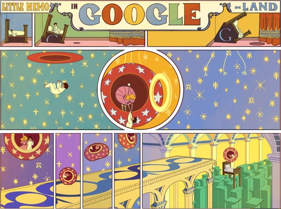 I can’t praise enough Google’s use of their homepage to give credit to animation and comic pioneers. Their front-page Google Doodle for Monday, October 15, is a tribute to Winsor McCay and his comic strip Little Nemo.