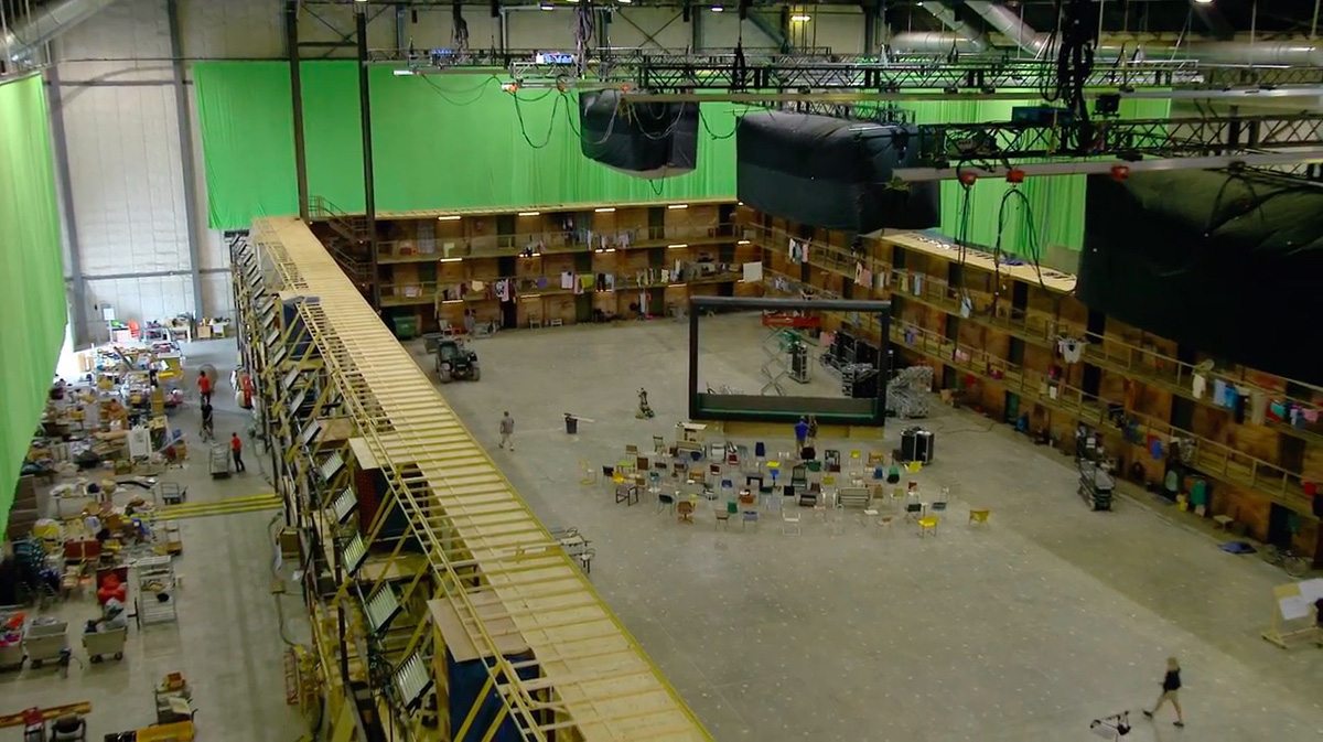 A number of things were done during filming of the background plates, too, to help the process. For instance, 3d-printed dolls were shot in the place of small people in the sets (and later painted out) – they gave a guide to the cinematographer in framing the shots and an eyeline for the normal-sized actors. Oversized partial sets were also part of the greenscreen elements, even if they might also be painted out later on.