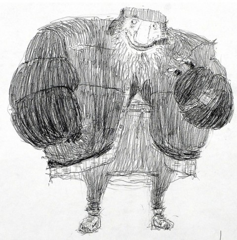 So what I went with was my gut reaction. I would do a bunch of drawings, and then Chris and the others would tell me which ones they gravitated towards and we’d go from there. I found out later that Mr. Prenderghast was originally drawn to be a skinny person, but my rendition they went with was as a fat, hairy guy.