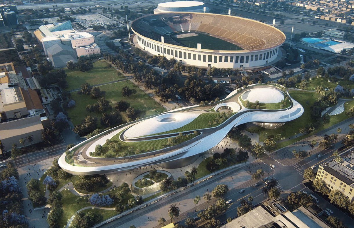Now renamed the Lucas Museum of Narrative Art, Lucas is still negotiating with both San Francisco and Los Angeles. In San Francisco, the museum would be located on the inconvenient Treasure Island (proposed design at top), while in Los Angeles, it would be more centrally located in Exposition Park. A decision by Lucas on the Treasure Island site is expected this month, according to recent reports.