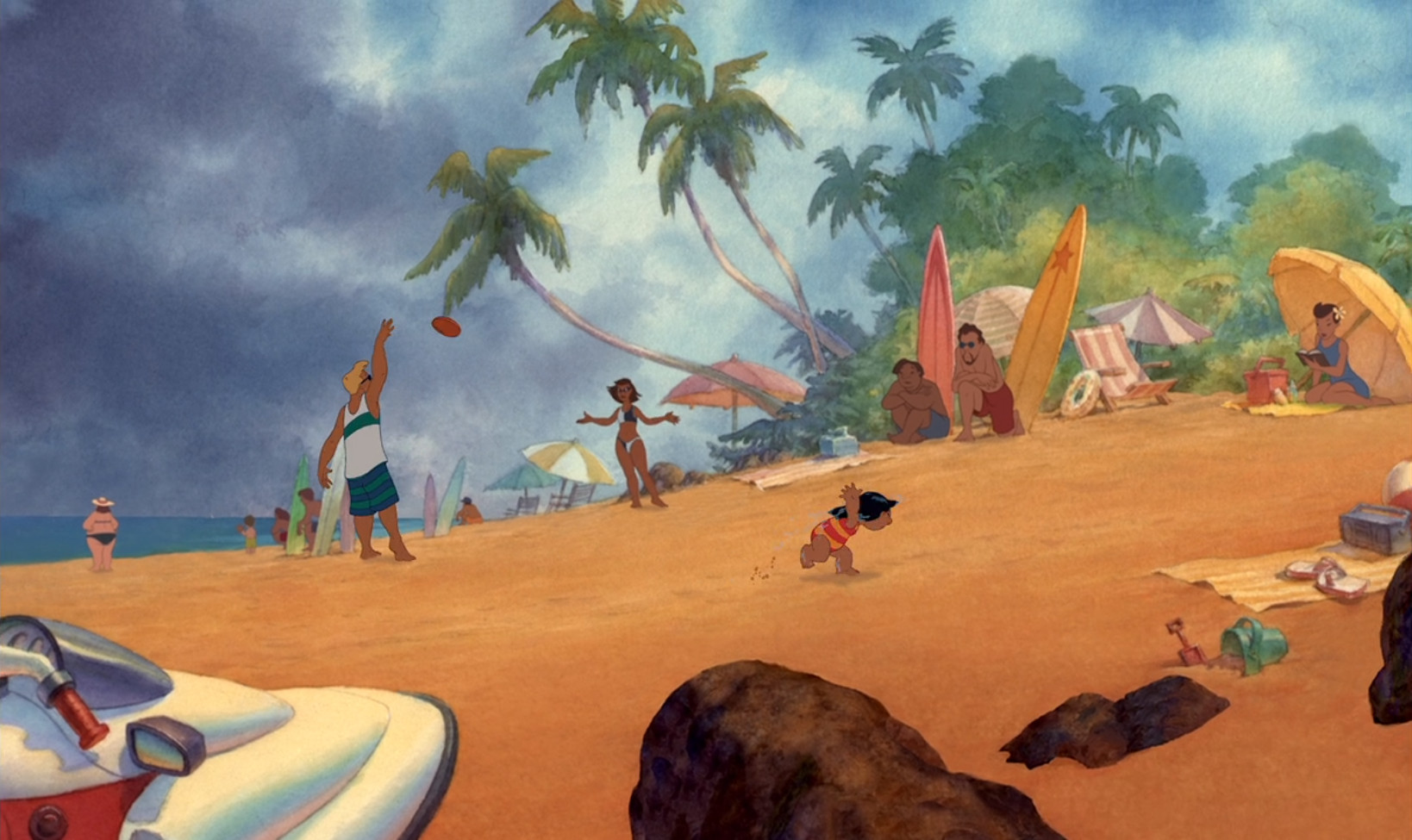 As an example, he recalls “a scene in which Lilo was coming onto the shoreline. It was the introduction of her character, and it was the first time you were gonna see her. We proposed that she would come in on this wave and run down the beach past people doing all these different things. [Eventually though,] instead of showing all that animation, she comes onto the beach and you see one really quick, wide shot where all the characters are actually frozen. They’re not moving save for like one character that’s throwing a Frisbee, and then [we] immediately cut really close to Lilo and she’s running through lots of legs that are, again, not moving and you don’t notice anything weird.”