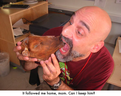 Frikki, the guy who brought me the sheep’s head, had picked it up at a drive-through where they sell the delicacy to busy Icelandic commuters hungry for a taste of face. By the time it reached me the noggin was cold and giving off an unpleasant muttony musk. The side dishes of potato and mashed yellow root thingie were room temperature as well. No matter. I had to geek the face or be pegged as a pussy for the rest of my stay. I channeled my inner caveman and grabbed a mouthful of cheek between my teeth, tearing it off to the appreciative murmurs of my barbaric audience. It tasted just like a cold lamb sandwich without the bread and mustard, except for the rubbery skin, which was similar to neoprene, but gamier. I ate some of the yellow root, but declined the eyeballs, offering them to Frikki instead. I was pleased when he passed on the peepers.