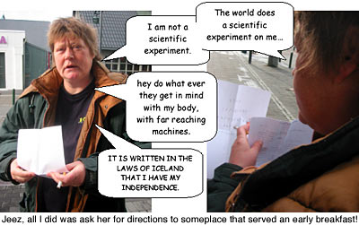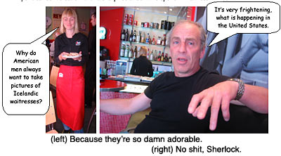 I got a cup of coffee from another cute waitress, ate a strange sort of sandwich, and had a political conversation with a sharp Icelander who spoke in flawless English.