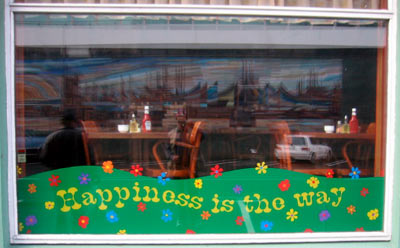 Even though I’ve been here eighteen days (Christ, is that all? It seems like a lifetime), this Saturday was the first morning I felt like I was able to get out and watch the city wake up (they party until the morning, and stumble out of bed quite late). I took a walk and met a friendly drunk who staggered down the street as I was snapping a shot of a sign saying “Happiness is the way.” I met a loony street person who gave me a copy of her crazed manifesto, both in English and in Runic, which I plan to have translated.