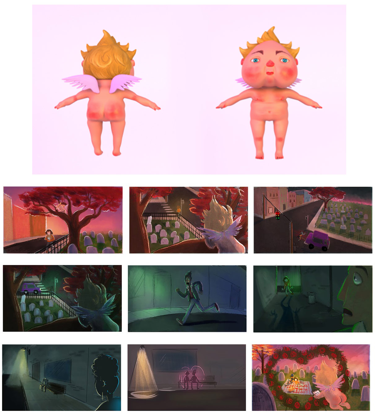 To develop her concept, Kaitlyn has been researching what it means to be viewed as “the other,” “monstrous,” and “different” by society, along with the meaning of love and romantic attraction. Stylistically, her 3d renderings and designs are inspired by stop-motion animation and handcrafted sets, such as Corpse Bride and Paranorman. She’s having lot of fun with the character designs as well — especially with Cupid, who was inspired by cherubs found on late 18th century Puritan gravestones. You can follow her Instagram: @fitz_illustration.