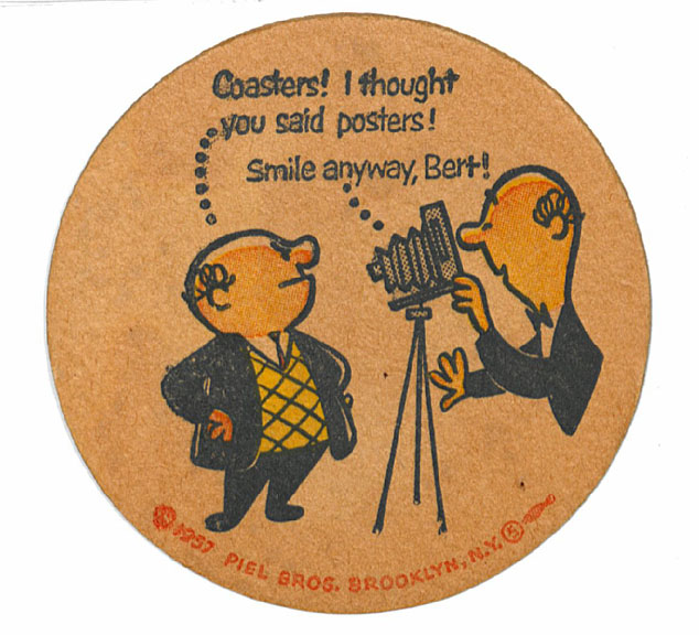 Just for fun – and thanks to Chuck Howell, the Archivist at University of Maryland’s Special Collections in Mass Media & Culture – we are happy to show off these cool 1957 Bert and Harry Piel bar coasters. The characters were created in 1953 for a TV ad campaign by UPA New York, under Gene Deitch’s supervision. Jack Sidebotham designed the characters for the Cunningham and Walsh agency – and of, course Bob Elliot and Ray Goulding provided the voices. For more about this (and to see one more of these coasters), read Gene Deitch’s account on his blog.