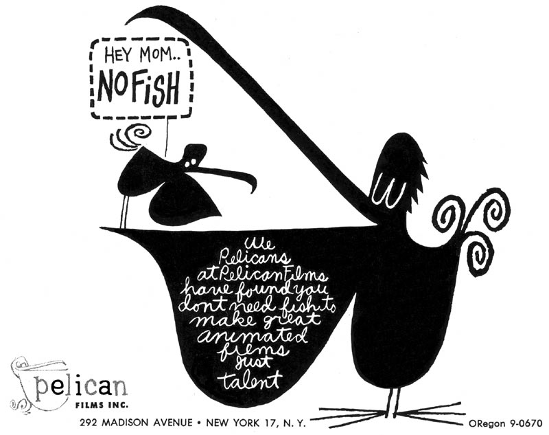 Last year on the Cartoon Modern blog, I highlighted a couple advertising productions by Zander which have been lost to time. I thought I’d share a few more Zander artifacts. At the top of this post is a late-’50s magazine advertisement for his studio Pelican. Below is a 1962 Pelican-produced ad for Jax Beer designed by Chris Ishii and animated by Emery Hawkins. Click on the image to see a set of stills from the spot. And below that is another one of the Jax commercials. The comedy team of Mike Nichols and Elaine May provided the tracks for the Jax spots.