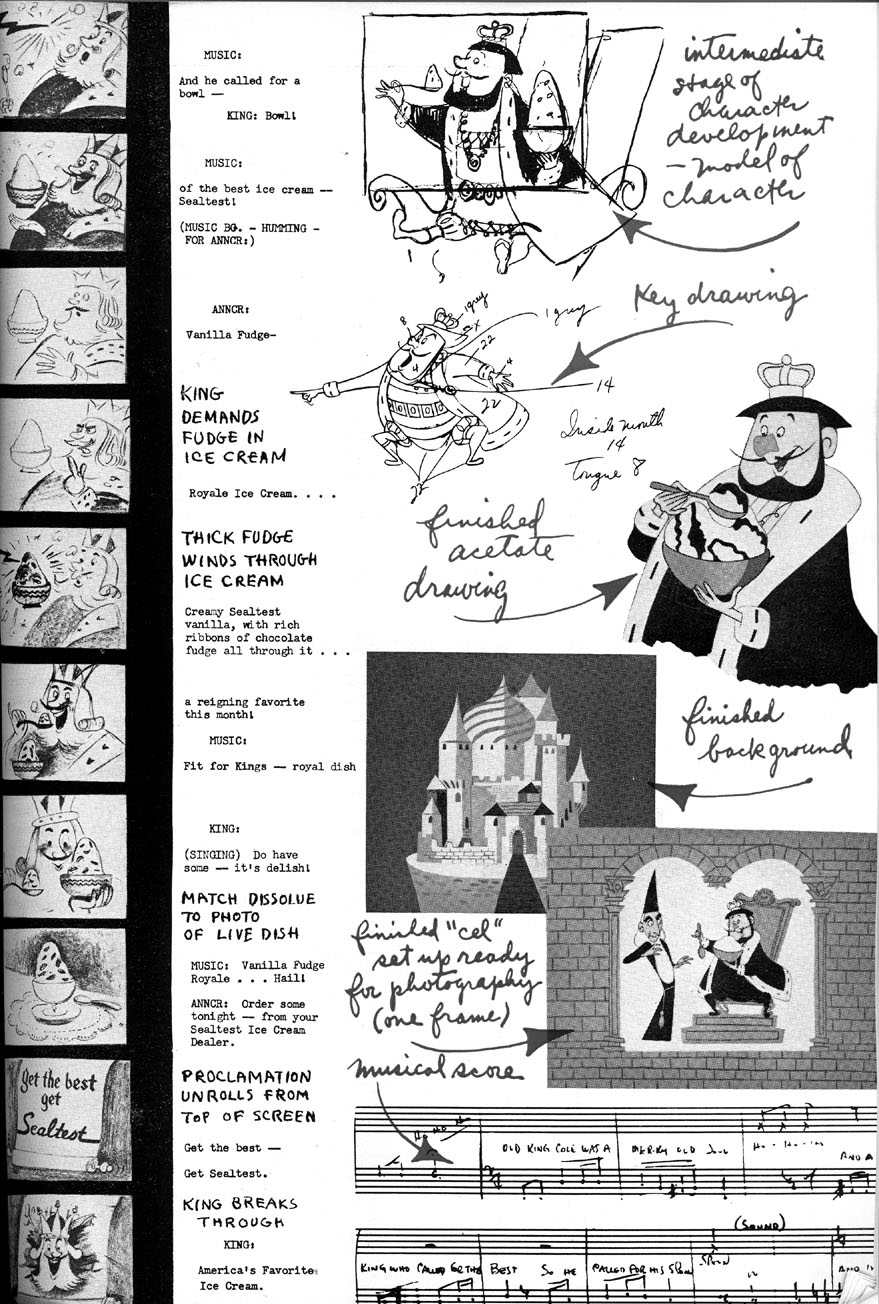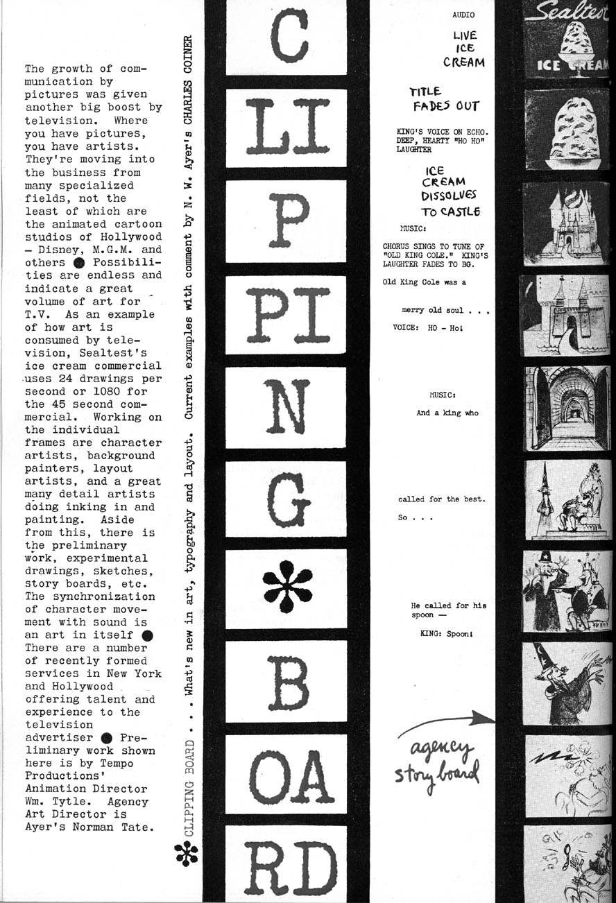 medium of television (click on thumbnails below for enlargements). These pages detail the creation of a TV commercial, for Sealtest ice cream, produced at Tempo Productions and directed by Bill Tytla (the article mis-spells his name “Wm. Tytle”).