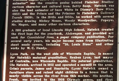 As mentioned here last week, this past weekend the fine folks of Wisconsin Rapids, Wisconsin, held an event to dedicate a Historical Marker honoring veteran animator and native son Grim Natwick, who passed away twenty years ago at the age of 100. The event was attended by Natwick relatives still living in Wisconsin Rapids. Our friend Maggie Thompson took this picture of the Marker: