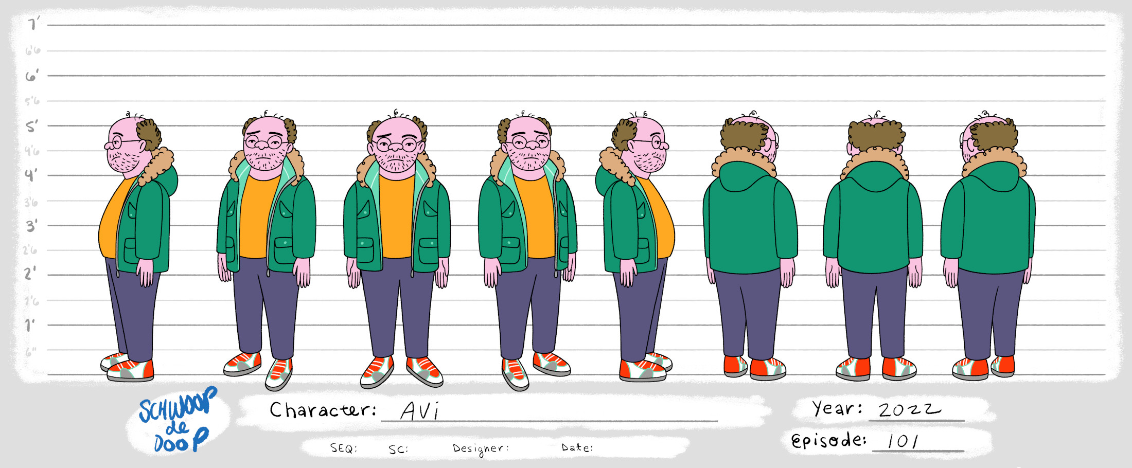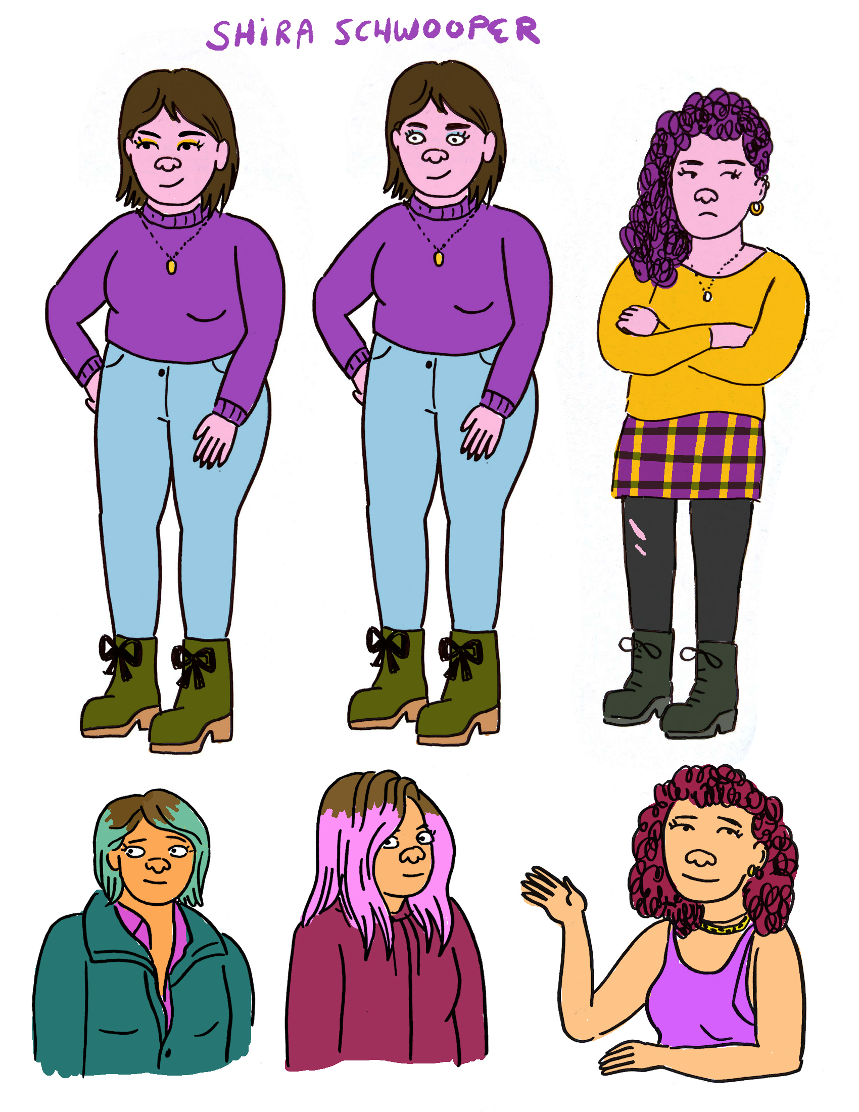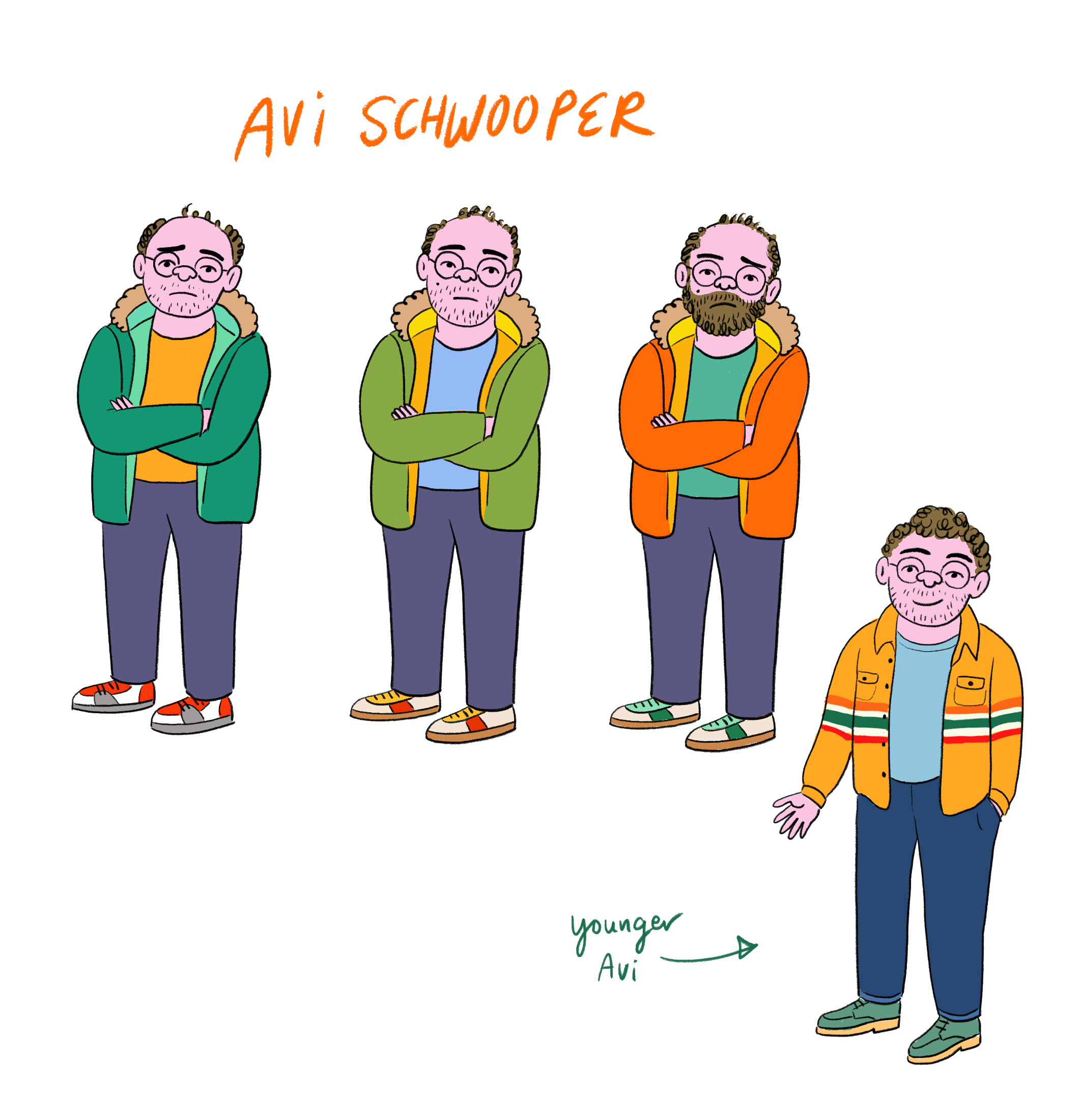 I’d never really done that style fully before, but it just popped into my head. I sketched Avi and Shira and nailed them right away. Naomi took longer. At first, I drew her to look too much like Raphael’s mom, and he wanted something different. Our art director, Alison Dubois, helped refine her.