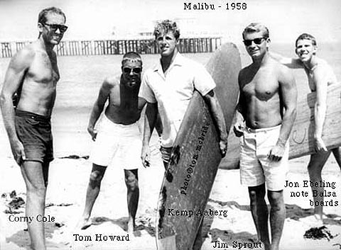 The image at the top of this post shows Corny (at far left) surfing at Malibu in the late-1950s. The photo is from Tom McBride’s website about vintage SoCal surfing.
