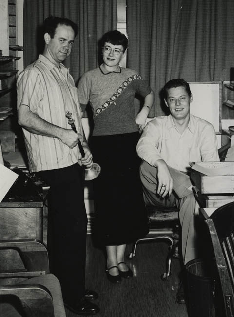 Mary Schuster with Ward Kimball (l.) and animator Julius Svendsen in November 1952 during production of Toot Whistle Plunk and Boom