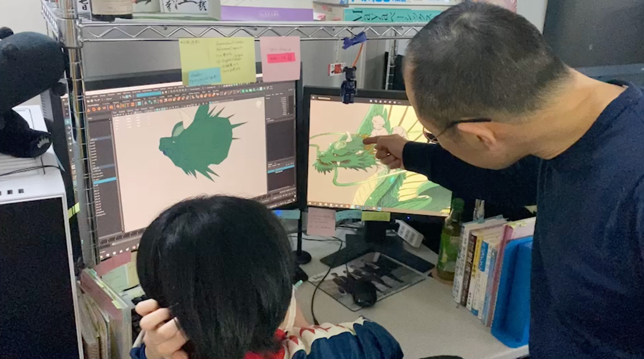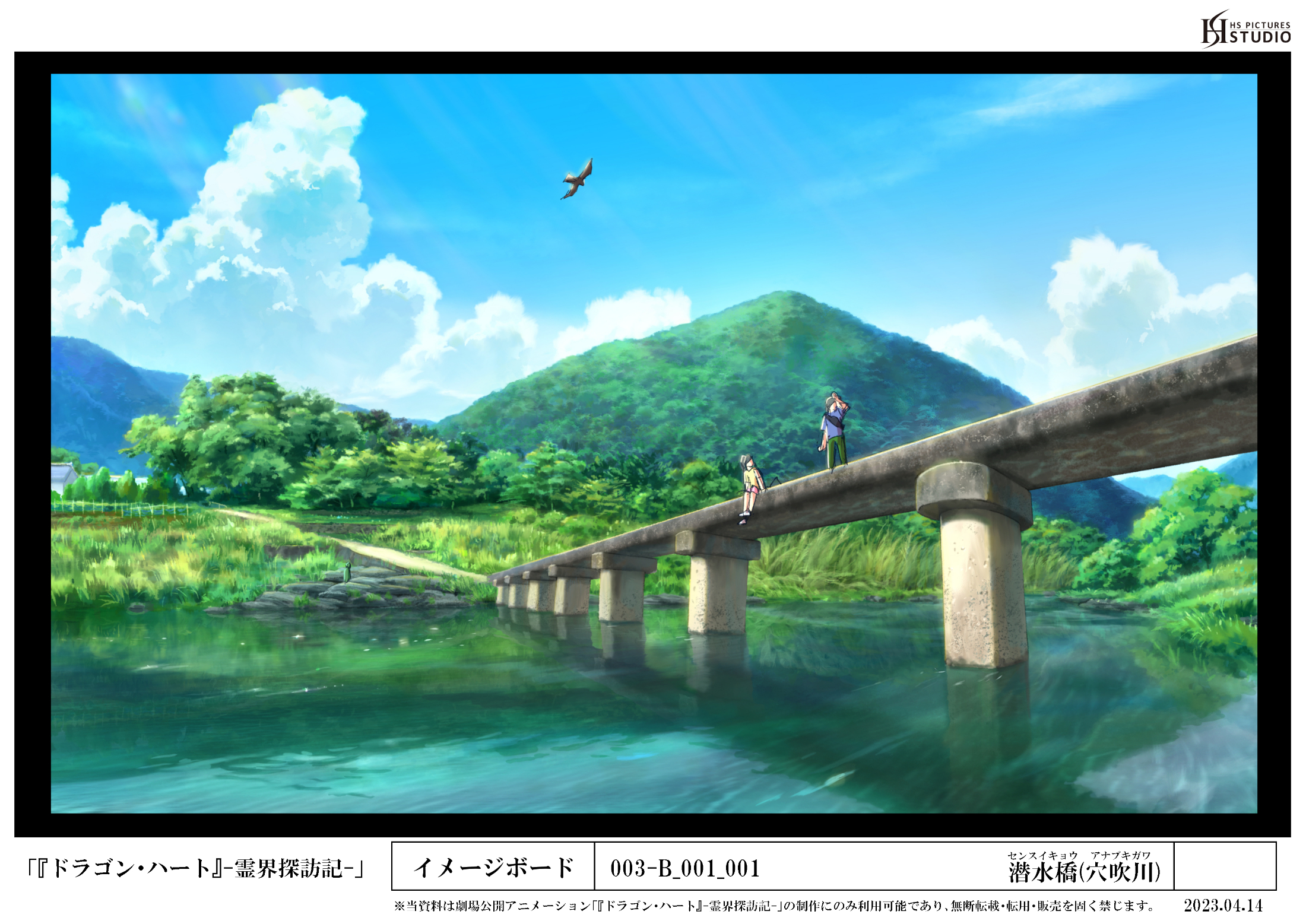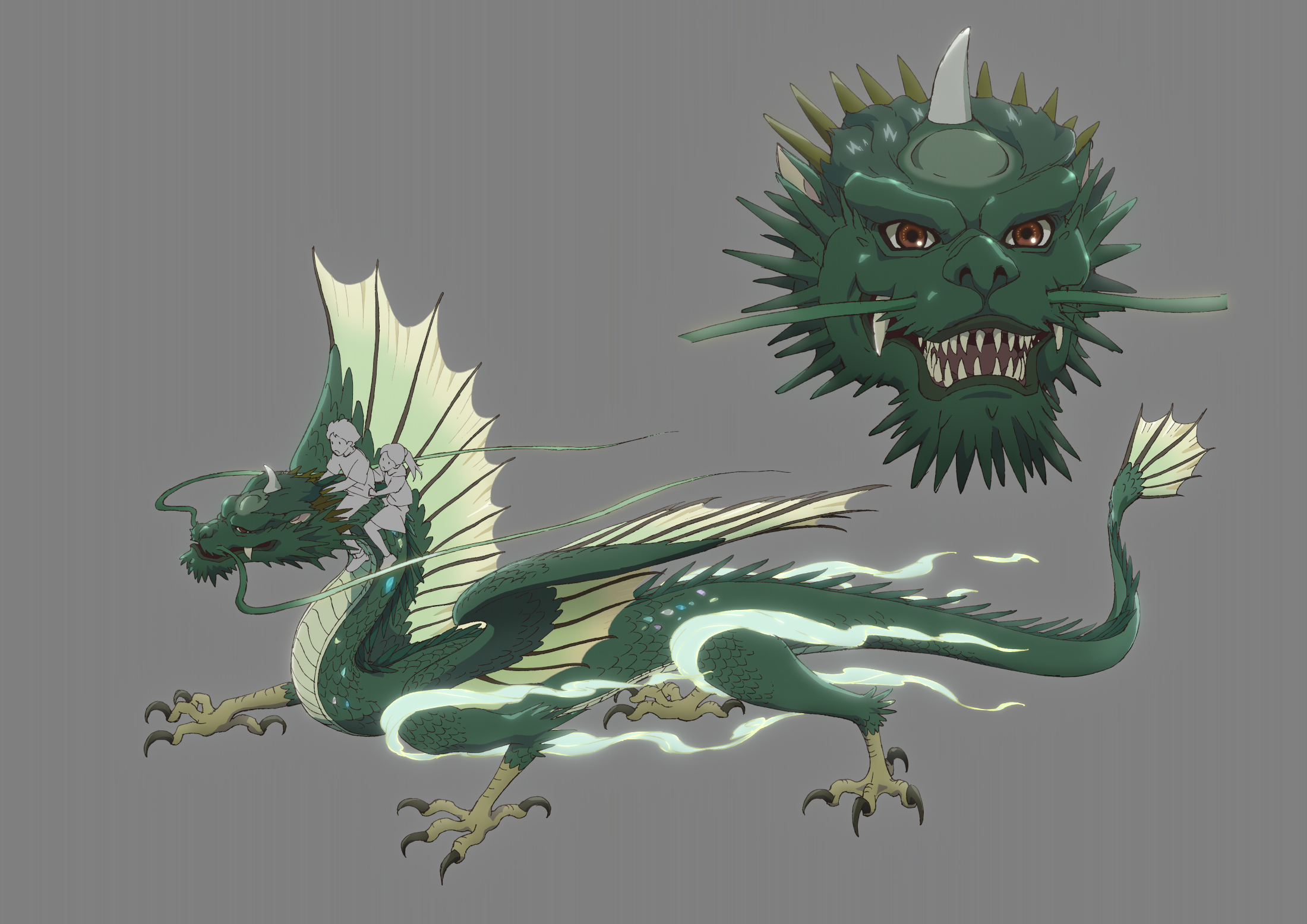I did research on traditional Japanese dragons. We also discussed how the dragon should be verbal or nonverbal. Our understanding was that this green dragon was a guardian who had resided in the Anabuki River for a long time. The Anabuki River and the Yoshina River that you see in the film are located near Mount Kotsu, where there is a shrine. In that shrine, Hiwashino Mikoto is enshrined. He is an old deity of Japanese myth, and he has been protecting that region for a long time. This story is the spiritual adventure of Ryusuke and Tomomi, who are protected and guided by this dragon, their guardian, and Ameno Hiwashino. When the dragon awakens for Tomomi and Ryusuke at the river, he has been waiting for them for thousands of years to help them go through their spiritual journey. So, I thought that words were unnecessary when the dragon awakens. To design the dragon, it was basically hand-drawn, but we also used 3D. We had a choice of 3D or hand-drawn, but when I considered how to express the dragon’s expressions and movement, we chose to use only hand-drawn animation.