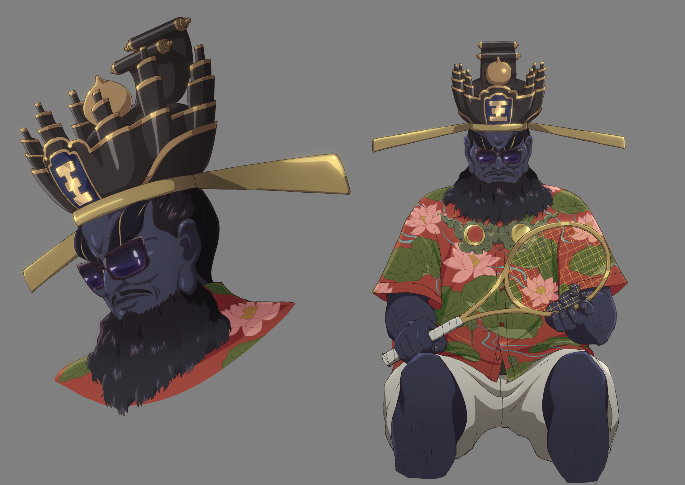 It has been said that the idea of King Enma has come from China and India. He serves as a judge of Hell, judging which world of Hell people will go to. I designed him based on the premise that King Enma is an enlightened being. But many people in the modern world do not know the existence of Hell. These people have done many crimes, deceiving or hurting people, which they don’t recognize as crimes. In our film, King Enma is fed up with his job because so many people come to his world, not knowing what they have done. So, he took on the character of a modern figure, wearing sunglasses and an Aloha shirt with a tennis racket in his hand. And, to show he is an enlightened person, I had lotus flowers printed on his shirt.
