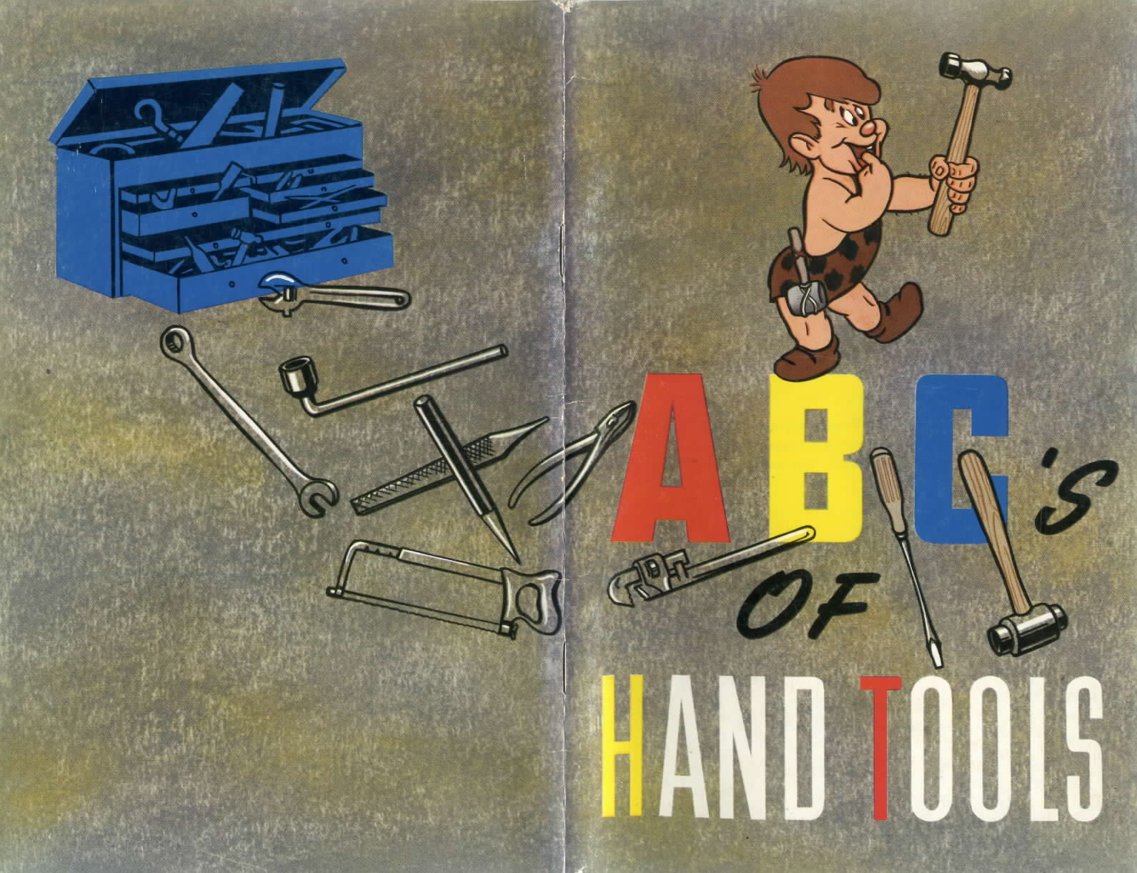 In 1946, long before it owned the ABC Television Network or created alphabet spelling books for children, Disney made an industrial film for General Motors called ABC'S of Hand Tools. Bill Roberts directed this educational short, aimed at adults, which demonstrates the proper use of common tools. The interesting thing is that the film (and accompanying booklet) re-uses the character "Emotion" (an uncouth caveman, and caricature of Ward Kimball, from the 1943 wartime cartoon Reason And Emotion - also directed by Roberts), here with a new name, "Primitive Pete". Bob Sokol posted a pdf of the entire booklet here. J.J. Sedelmaier sent us large scans (below) of several pages of his copy.