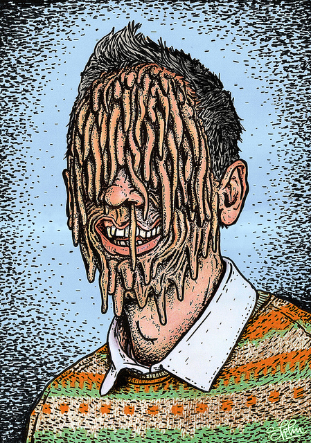 The brains of these figures are compromised–sometimes portrayed as dropping into a pool of blood or being picked at by a vulture-like bald eagle–so comprised possibly that they are missing the capacity for human empathy. Are they all portraits of psychopaths perhaps? I’m guessing that Milos’ answer might be affirmative—these are the psychopaths who run your government, military, religious and corporate institutions.