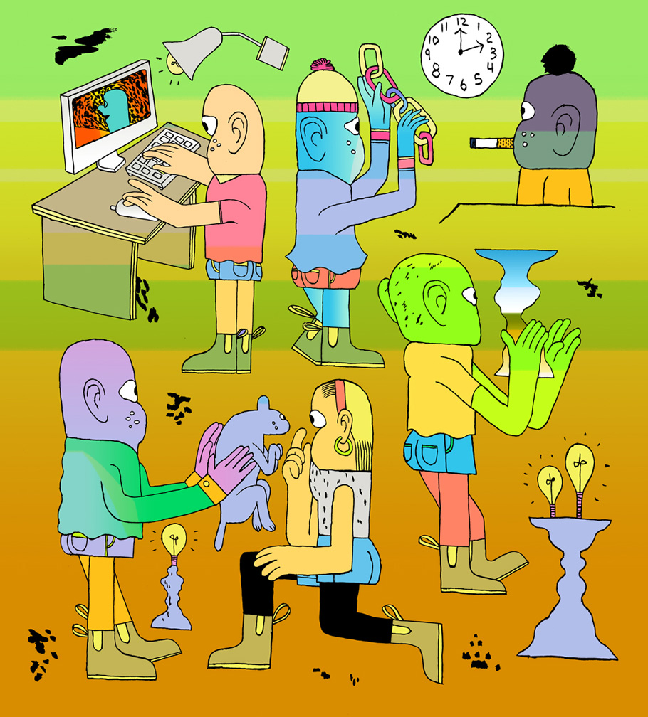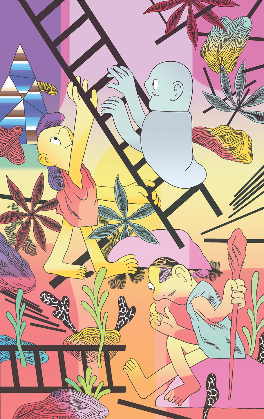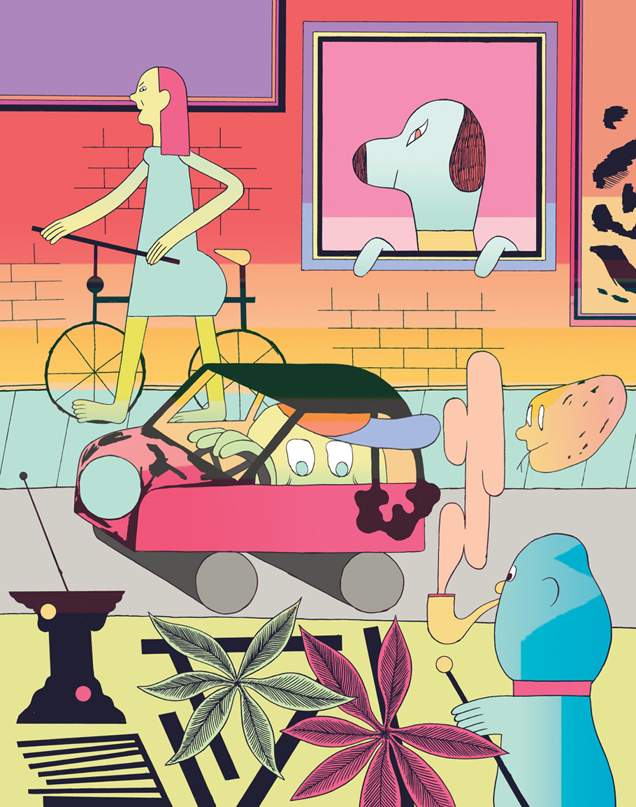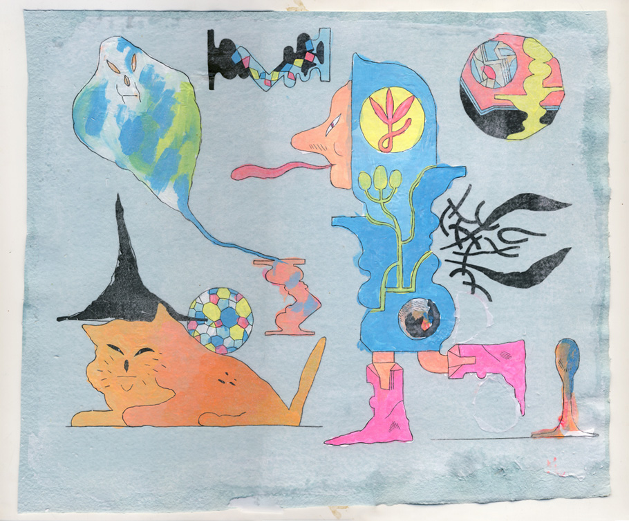 Patrick Kyle is a Toronto-based comic artist and illustrator. His non-traditional comic designs often feature troll-like creatures and a world rendered with a flat sense of abstract space and gradated pastel and neon hues. One series of drawings on Patrick’s website is directly inspired by the troll illustrations of Swedish artist John Bauer. Below is the cover to Patrick’s recent mini comic, Foreigners, published by Space Face Books.