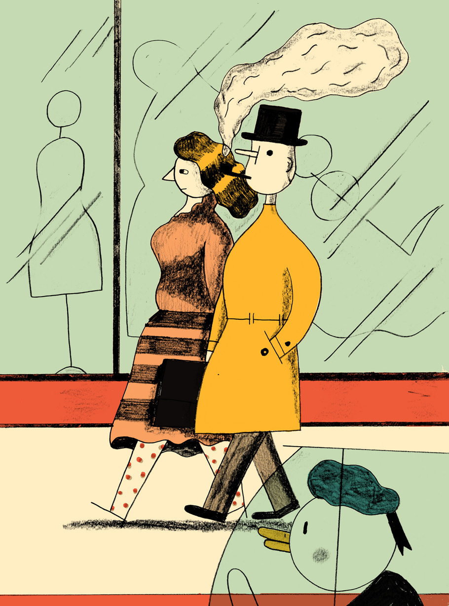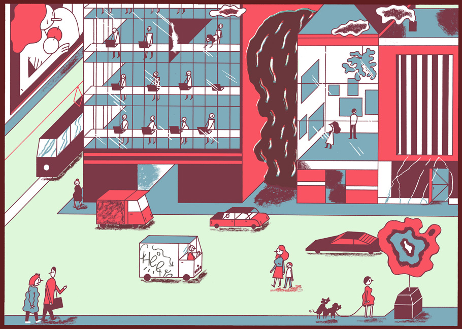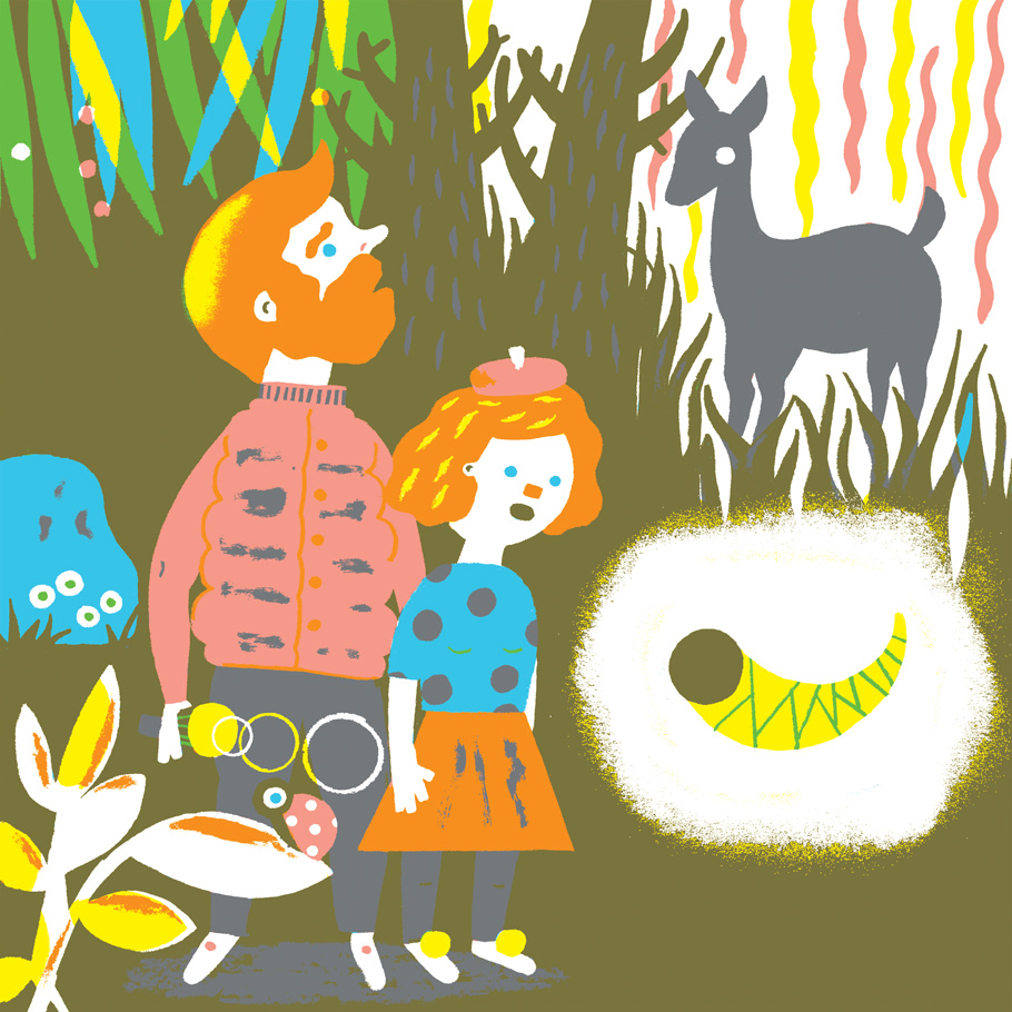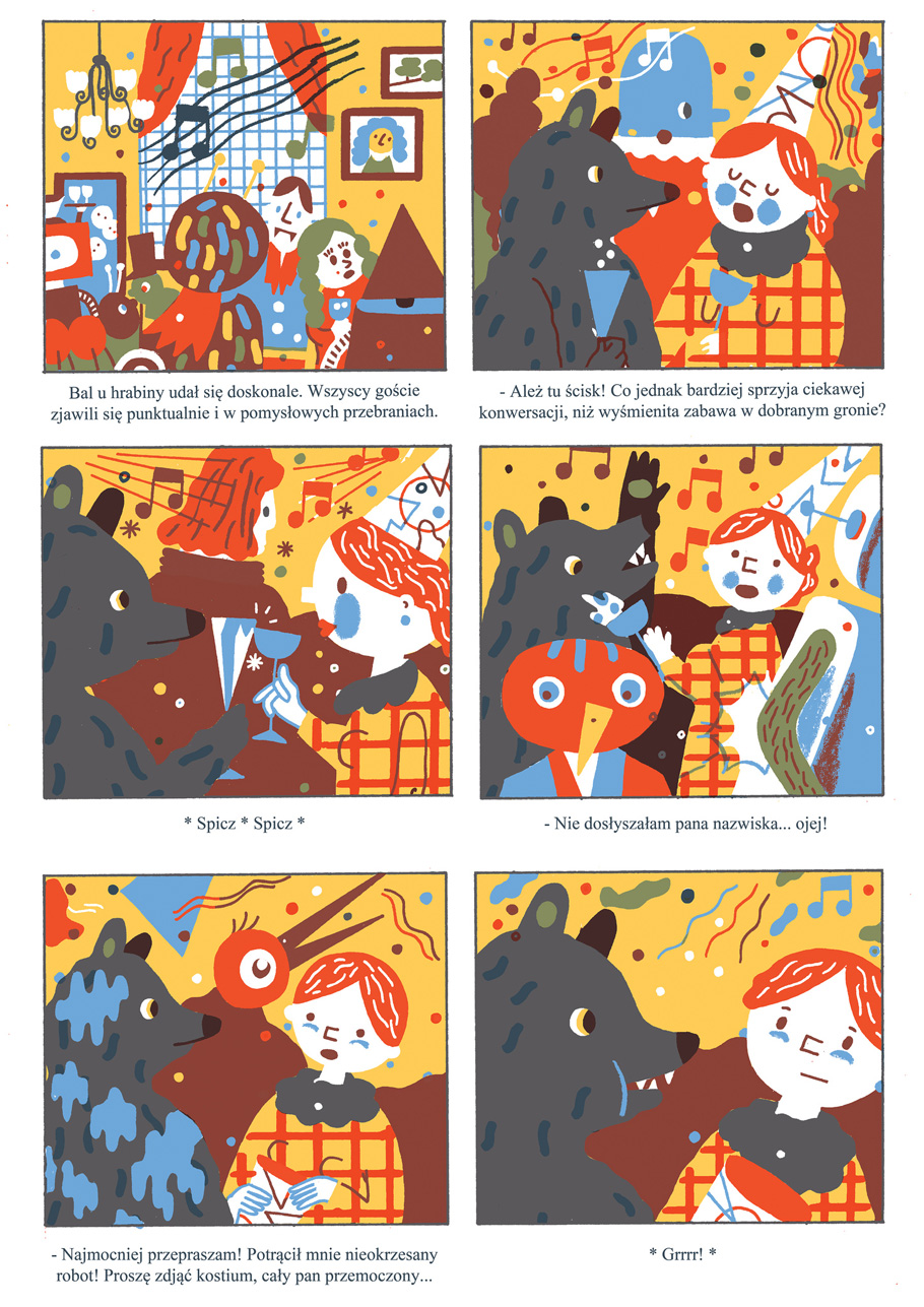 Wroclaw, Poland-based artist Pawel Mildner composes narrative images with all types of characters. Mildner’s recent style of image-making involves bold, bright colors and characters rendered with solid flat shapes and simple lines. Other work is drawn in pencils and colored digitally with a grungy aesthetic.