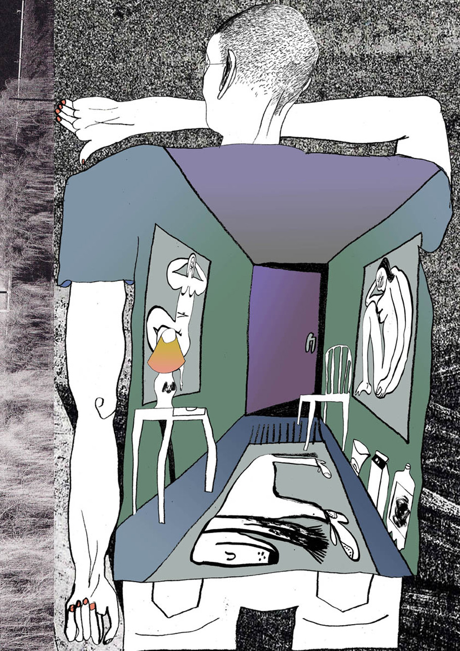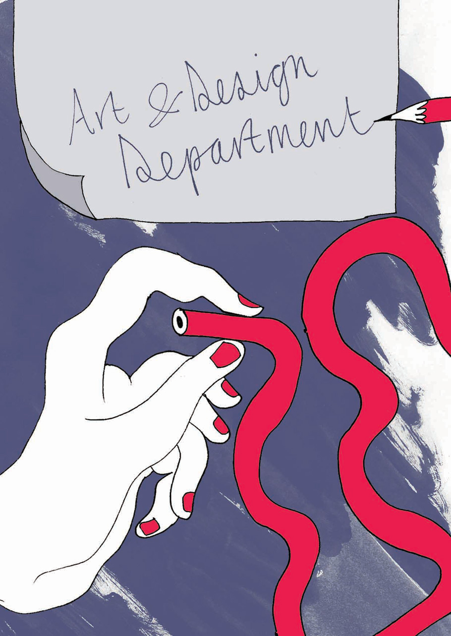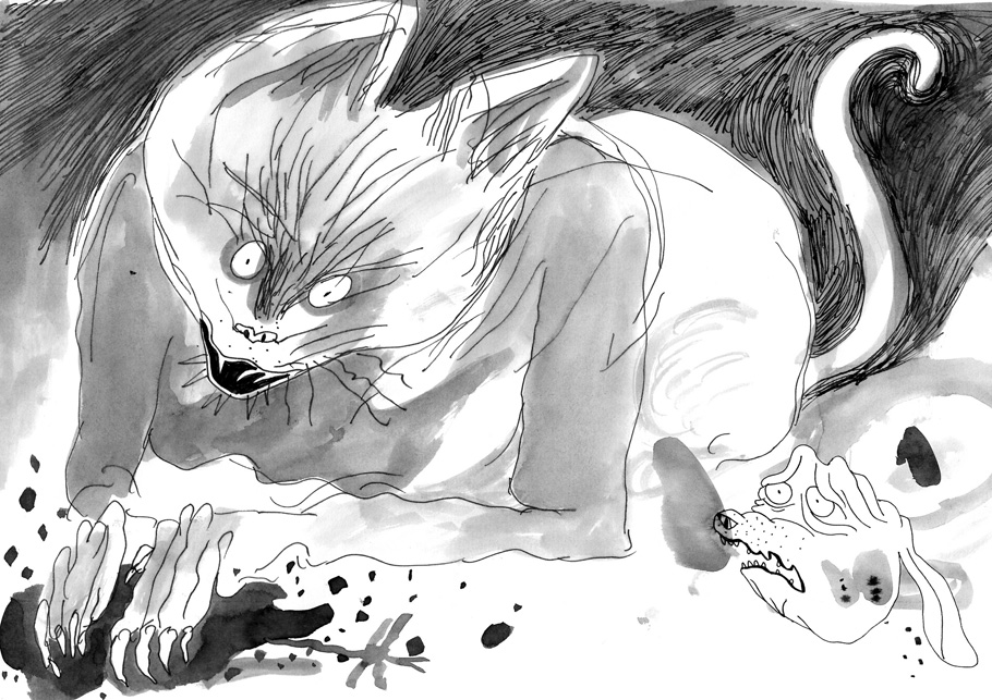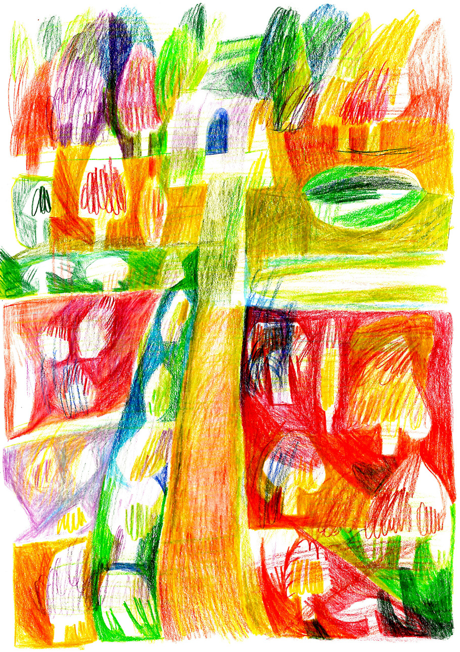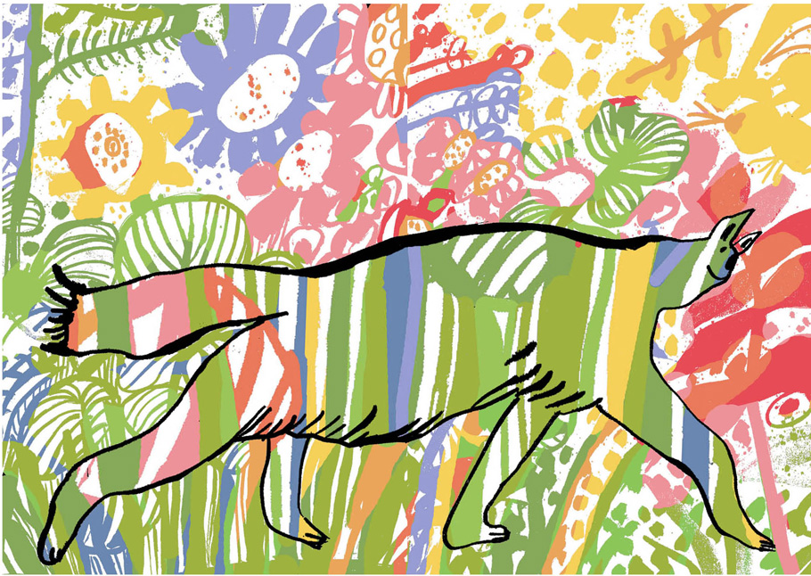 UK-based artist Rebecca Crompton draws scenes in ink, pencils and crayons of smiling animals and people existing in flat, textured planes and highly stylized natural settings.