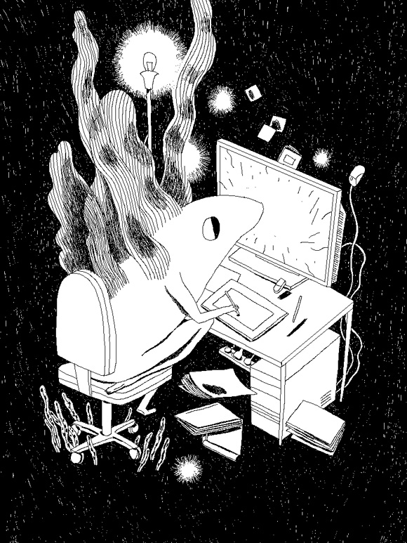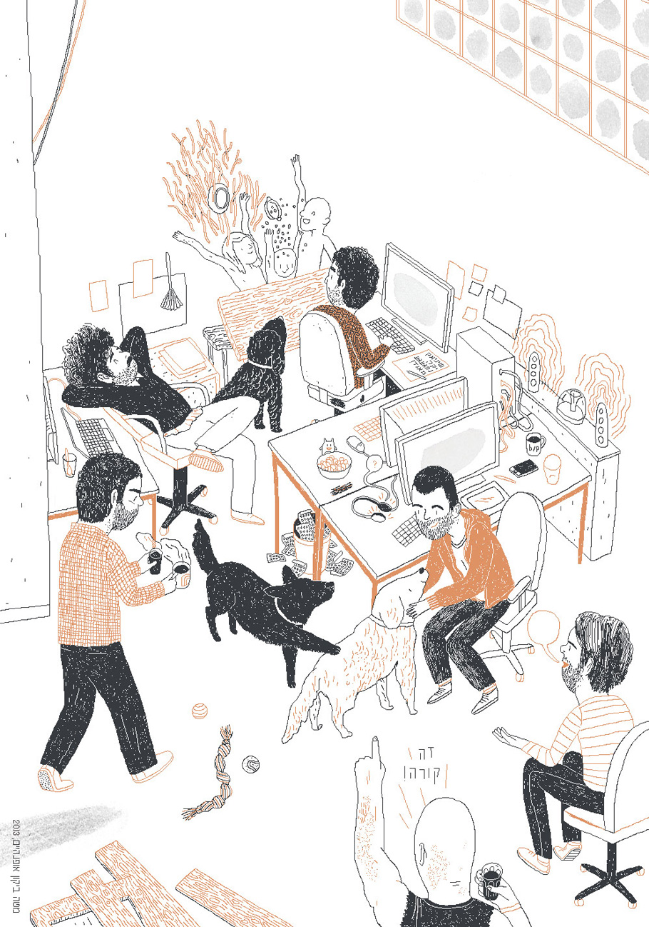 Israeli artist Shimrit Elkanati creates narrative illustrations (and some animation) in scratchy pencils and pixels, depicting both family life and office culture, as well as imaginative scenes with children and animals. Here is Shimrit’s take on a rough morning at the office, BOKER (morning):