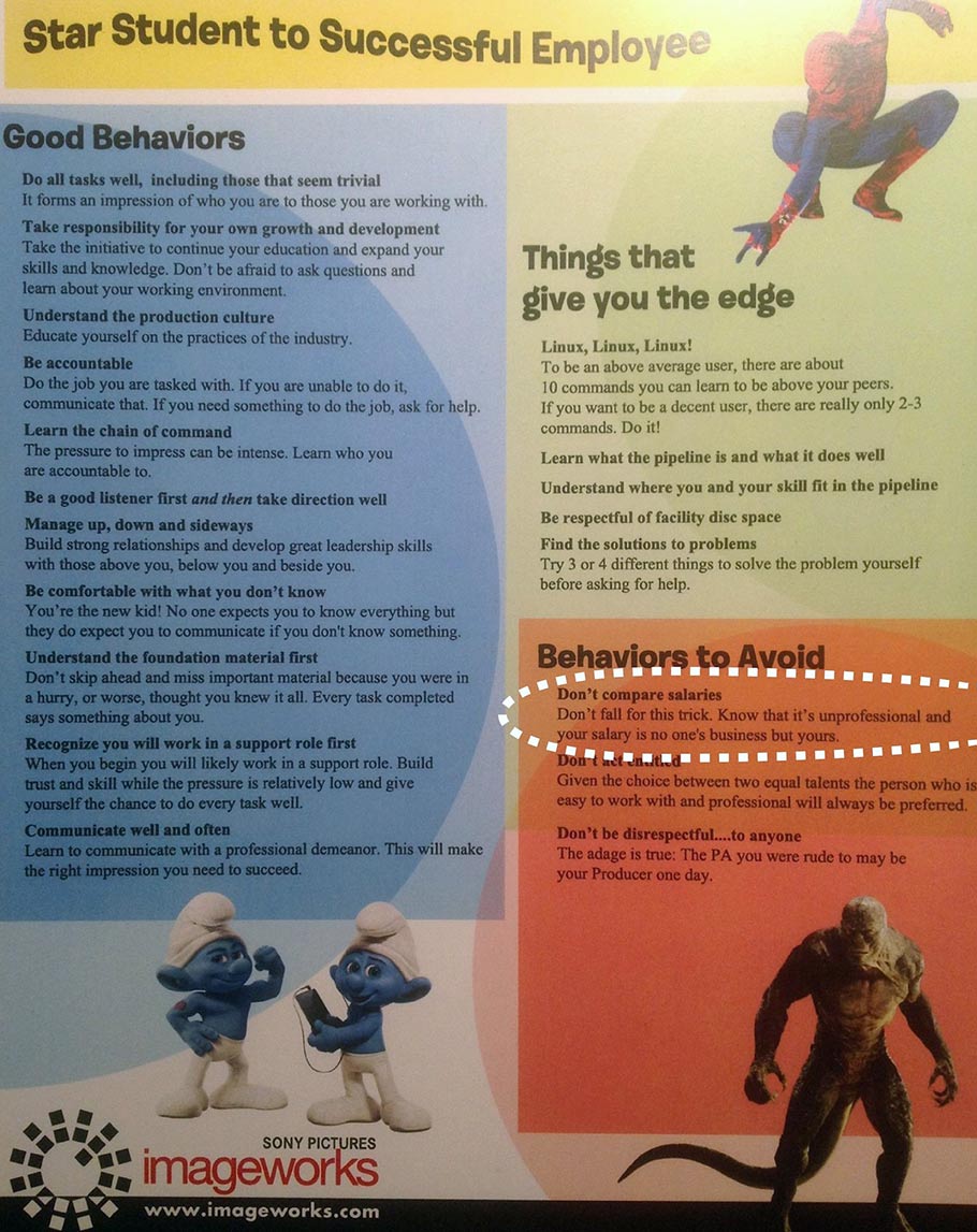 At the recent CTN animation circus in Los Angeles, they handed out leaflets explaining how to be a “successful employee.” In the “behaviors to avoid” section, they encouraged young artists to not compare salaries, brazenly telling kids: “Don’t fall for this trick. Know that it’s unprofessional and your salary is no one’s business but yours.”