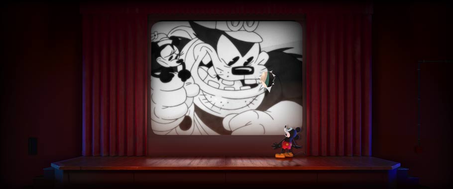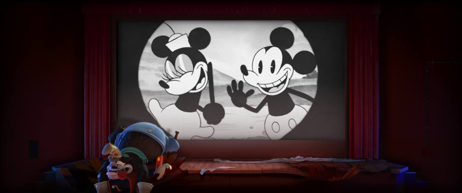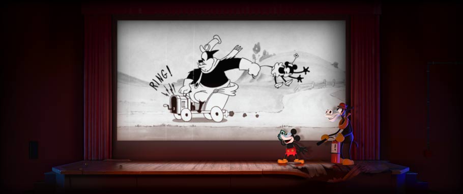 Lauren MacMullan: Story artist Raymond Persi came up with this idea of cutting close so Pete suddenly dwarfs a tiny Mickey, lost alone on stage. The Mickey of this era was a littler guy, physically an underdog. His only chance? To outwit Pete.