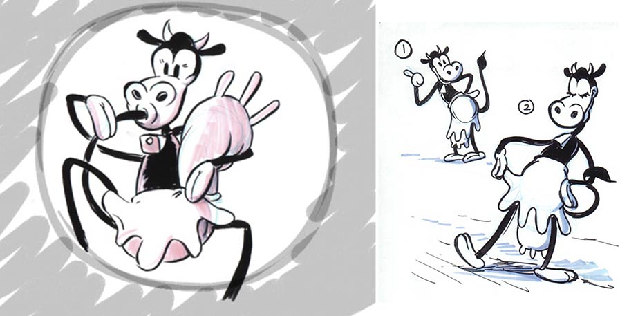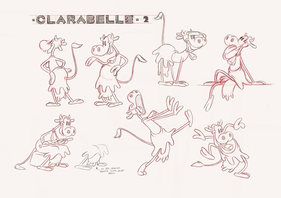 Lauren MacMullan: Oddly enough, no model sheets from this 1928-30 era could be found. Clarabelle herself was sometimes a mere cow, sometimes upright in a schoolmarmish dress. Here was my attempt to split the difference with a half dress. Dale Baer contributed some poses as well.