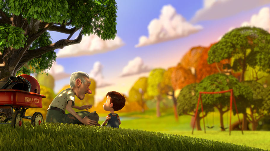 “Taking Flight is a great addition to our body of work at Moonbot, because we have been able to once again combine many animation techniques,” Trish Farnsworth-Smith, who executive produced the short with Joyce, told Cartoon Brew. “Taking Flight relies on both 3D and 2D animation, and we looked to classic animation styles to drive the imaginative moments of the film. Our artists and animators spent time studying the work animation greats like Chuck Jones to develop beautiful and expressive sequences that take place in the imagination of our main characters.”