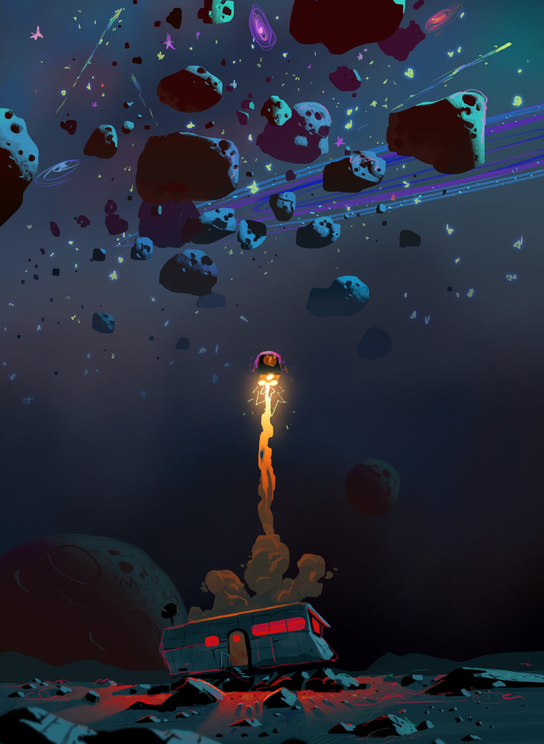 With that in mind, I wanted an illustrative and textural approach throughout. It’s in sync with the way I draw and with the 2D origins of this short. Watercolor also became really important to tie the two worlds of the short together – the dusty, subdued world of the desert and the loose, vibrant space sequences.