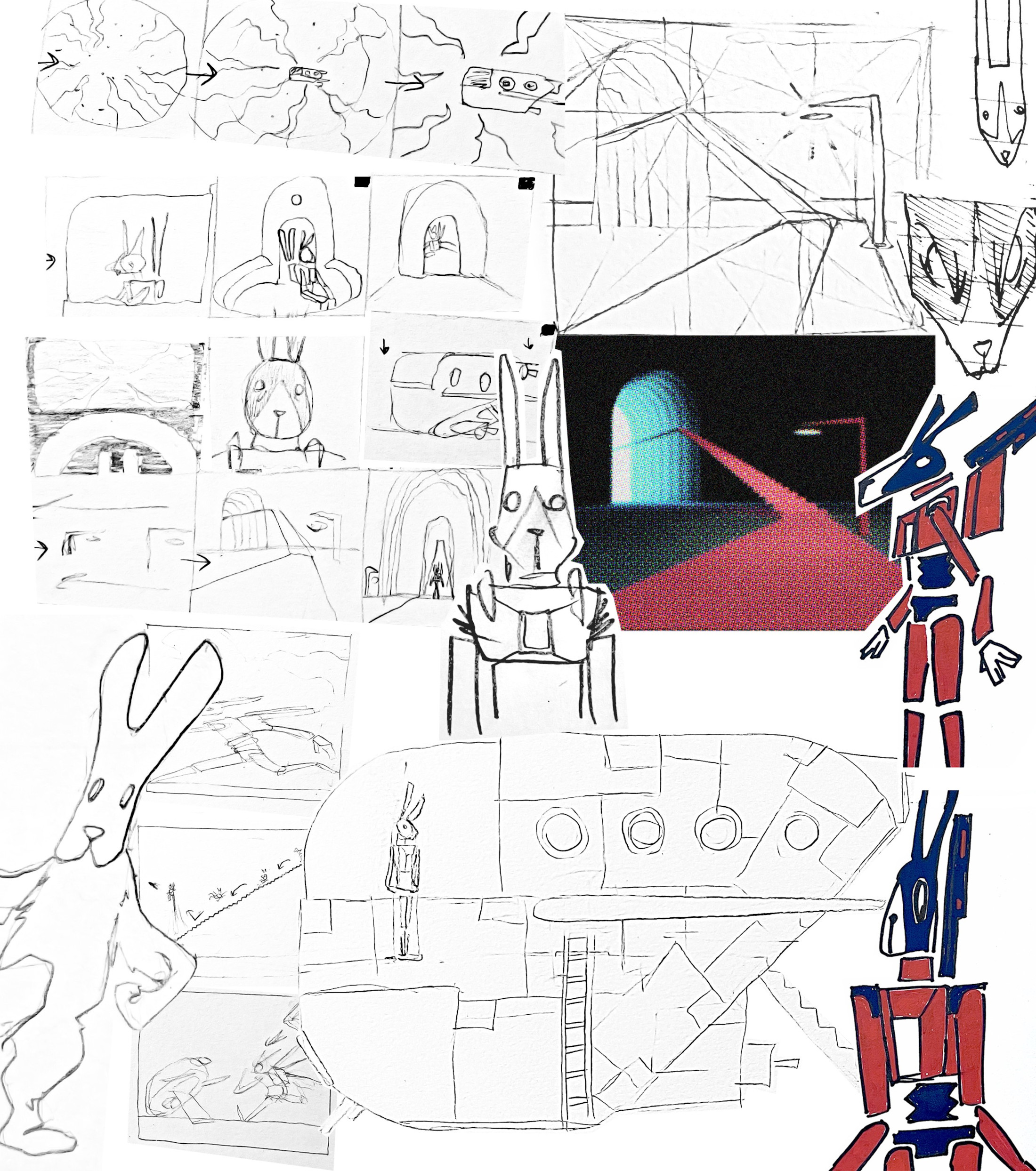 Sam Gualtieri: The main character in the film was modeled after my family’s rabbit, who had recently passed. I drew him as a spaceman, with no story in mind. Just this image of a mid-century hero floating in the sky. Then my Nonno (grandfather), who loves old cartoons and always called my pets “rats,” began to appear in my sketches. Later, I remembered my Nonno’s own emotional story about a rabbit. I was only a sophomore at SCAD, but I called my dad and said, “Hey, I think this might be my thesis project. Sorry.”