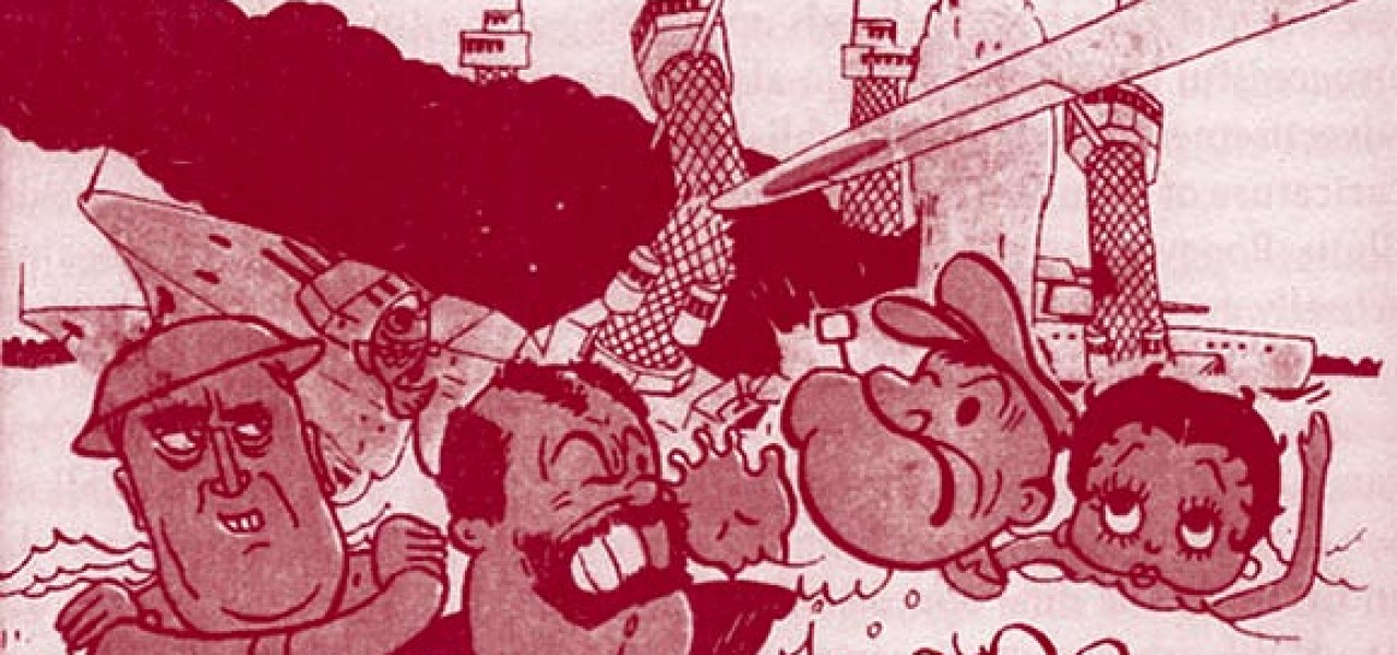 Annett reproduces an advertisement for the 1943 Japanese propaganda cartoon Momotaro’s Sea Eagles. Bluto, who appears in the film as an antagonist, is seen floating in front of the ruined Pearl Harbor. Splashing alongside him are three characters who are nowhere to be seen in the animation itself: Popeye, U.S. President Franklin D. Roosevelt, and Betty Boop. The war may have recast Betty as an enemy of Japan, but she was apparently still popular enough to be a box-office draw.