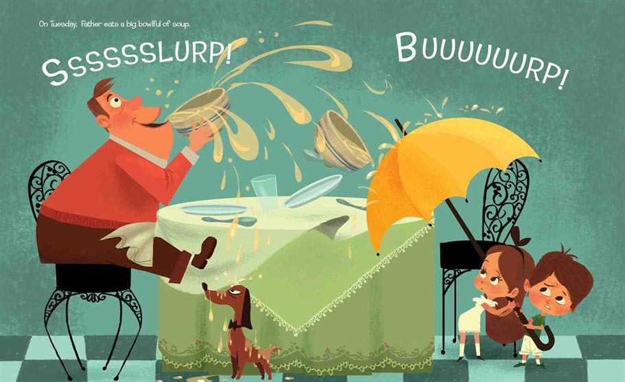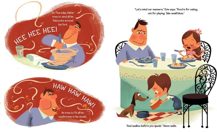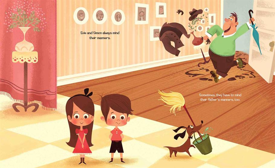 Evie and Simon always mind their manners. But sometimes, they have to mind their father’s, too! In this humorous spin on manners books, two kids teach their father everything he needs to know about mealtime etiquette. Everything is going well, until a surprise visitor arrives for dinner! Will Father be able to remember all of Evie and Simon’s lessons?