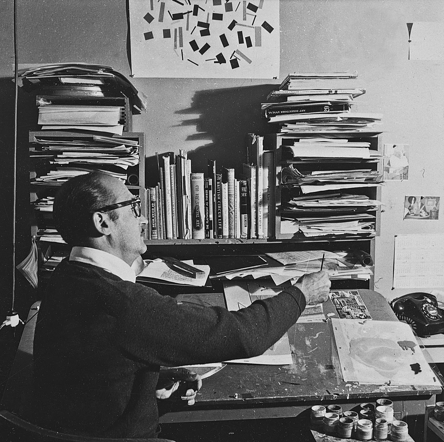 I was reminded of this when I found a photo of Jules Engel, a background painter who started at Disney prior to joining the Modernist studio United Productions of America (UPA). The shot below was taken at UPA circa 1954-’55. Engel later made his own independent shorts and created the CalArts Experimental Animation program, which he ran until his death in 2003.