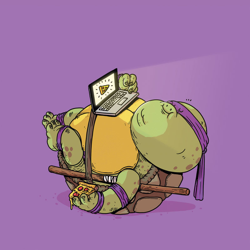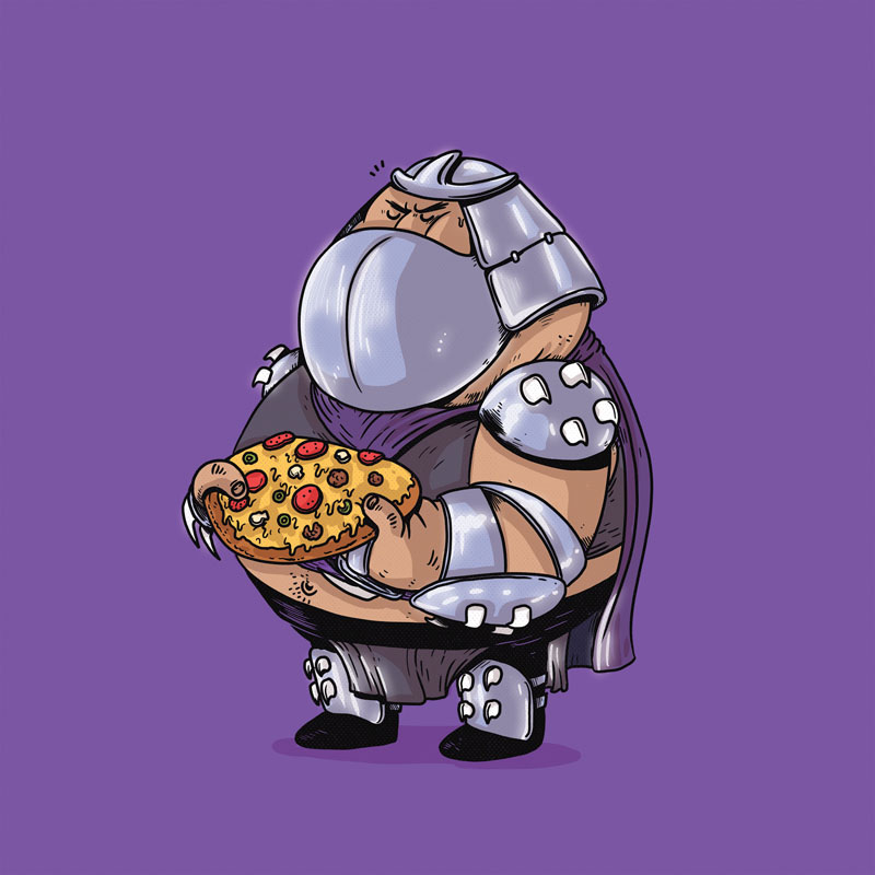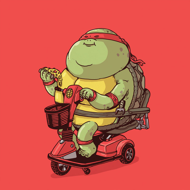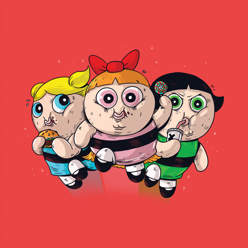 We noticed that despite their strict pizza diet, the turtles could tirelessly fight crime and battle villains. This is pretty common with characters in other cartoons and comic books—they somehow have amazing superpowers despite eating super bad-for-you junk food. I thought this could be sending mixed messages to kids. I created this series to raise awareness about unhealthy eating habits. I wanted to show what these characters would actually look like if they ate so much junk food.