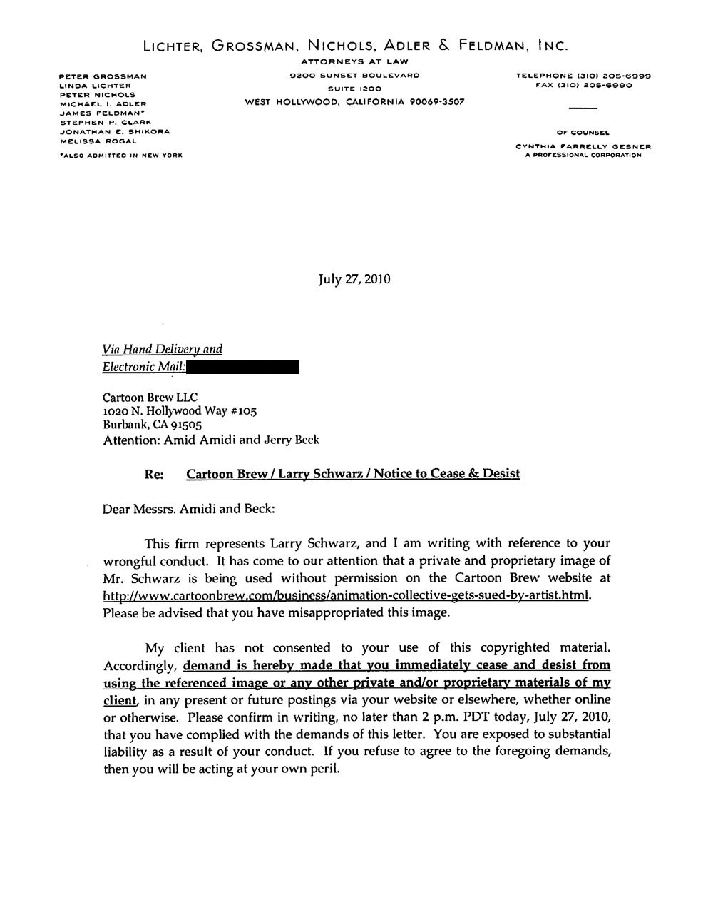 Animation studio owner Larry Schwarz (pictured above in the sombrero) wasn’t pleased with our story from a couple days ago that reported about a lawsuit against his company Animation Collective. His lawyers sent us a cease and desist letter. Here’s the letter:
