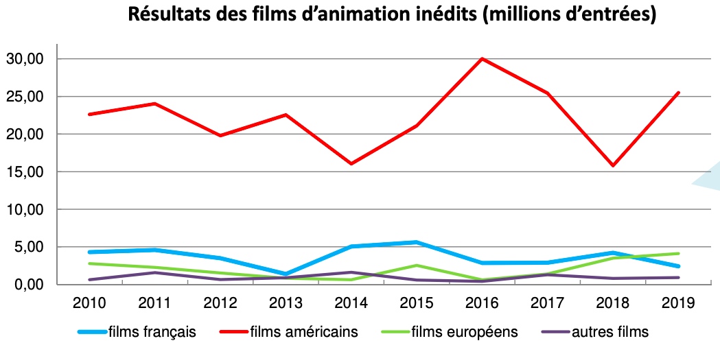 - In France, American animation is far more popular than homegrown films. Eleven French animated films and 14 from the U.S. came out in France’s theaters in 2019. The former sold 2.4 million tickets between them, while the latter shifted 25.5 million. For the first time, non-French European animated films also outsold French ones. (These numbers all refer to new releases.)