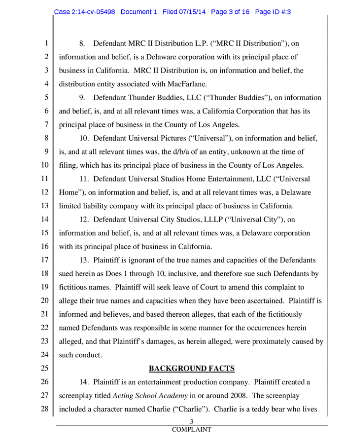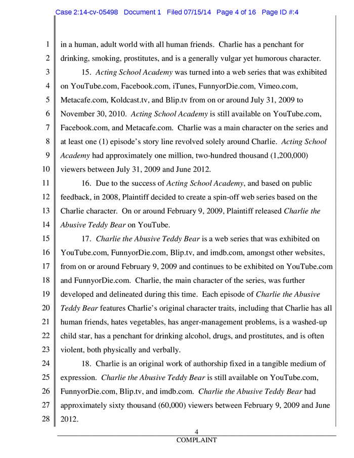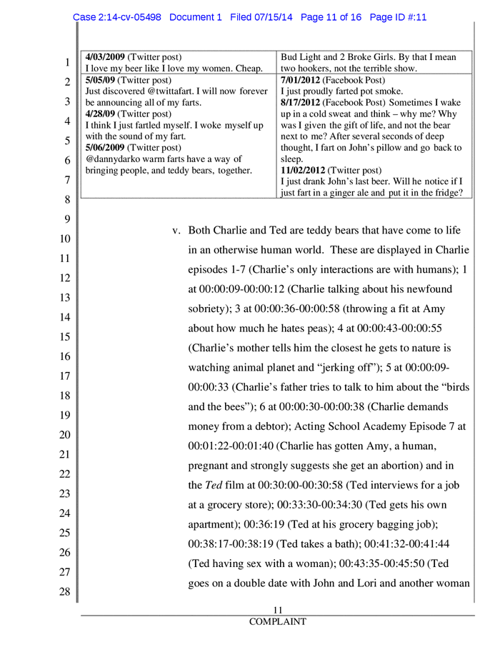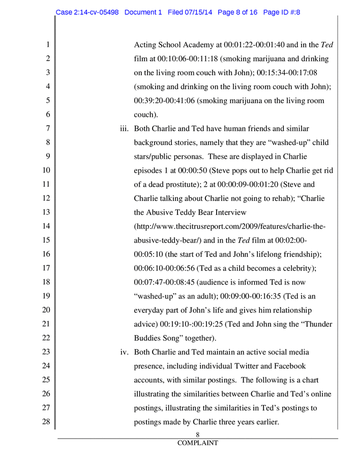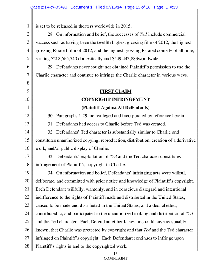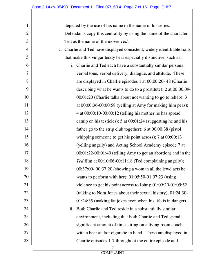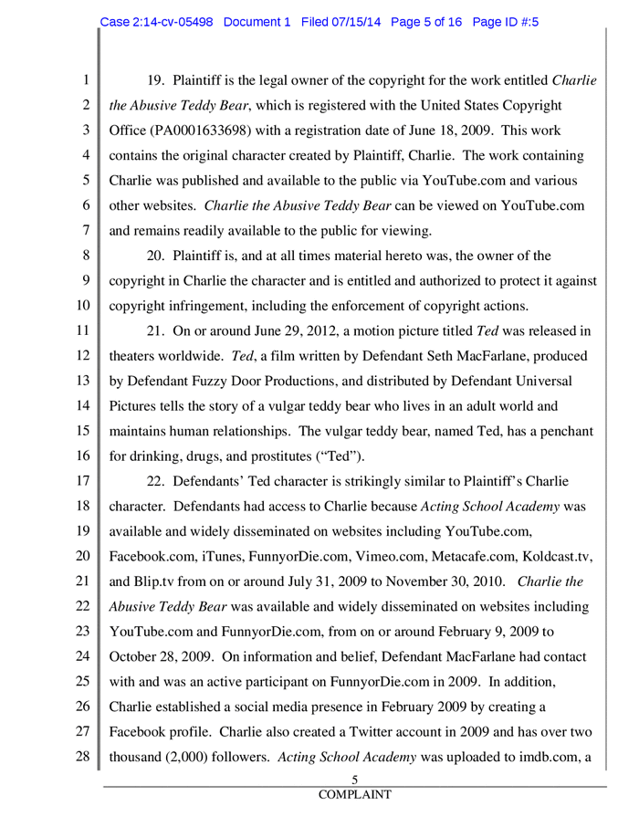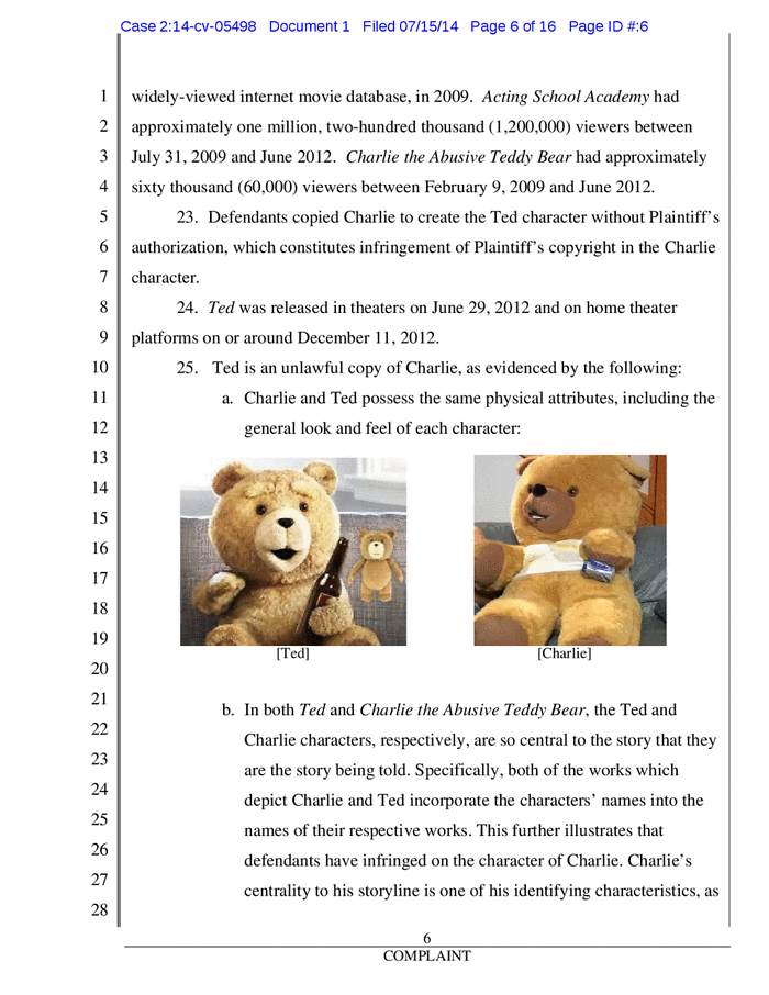 In a complaint filed this week in the U.S. District Court in Los Angeles, Bengal Mangle Productions claimed that Ted was “strikingly similar” to their creation Charlie, a bear who lives in the human world and has a penchant for drinking, smoking, and soliciting prostitutes. The character was created in 2008 for the screenplay Acting School Academy, and subsequently appeared in the webseries Charlie the Abusive Teddy Bear, which was posted on YouTube, FunnyorDie, and Blip.TV. The videos in the webseries had approximately sixty thousand views between February 2009 and June 2012, which amounted to less ten thousand views per episode. Here’s an episode from 2010 entitled Charlie Kills A Hooker: